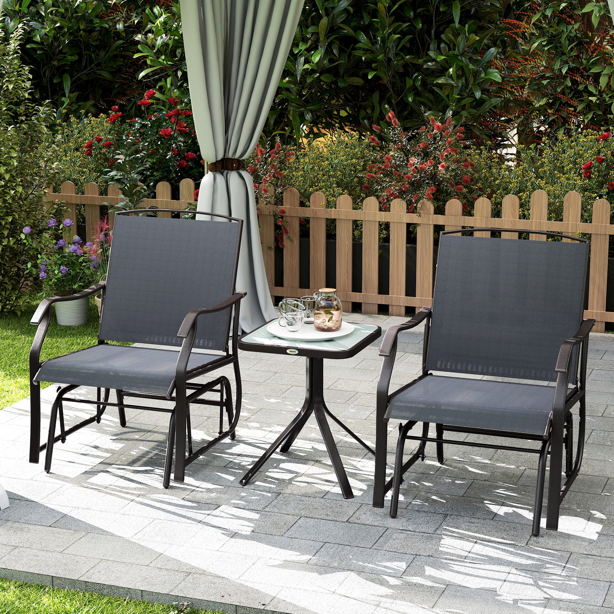 • 3 Piece Outdoor Glider Chair with Coffee Table Bistro Set, 2 Patio Rocking Swing Chairs with Breathable Sling Fabric, Glass Tabletop, for Backyard, Garden and Porch, Gray