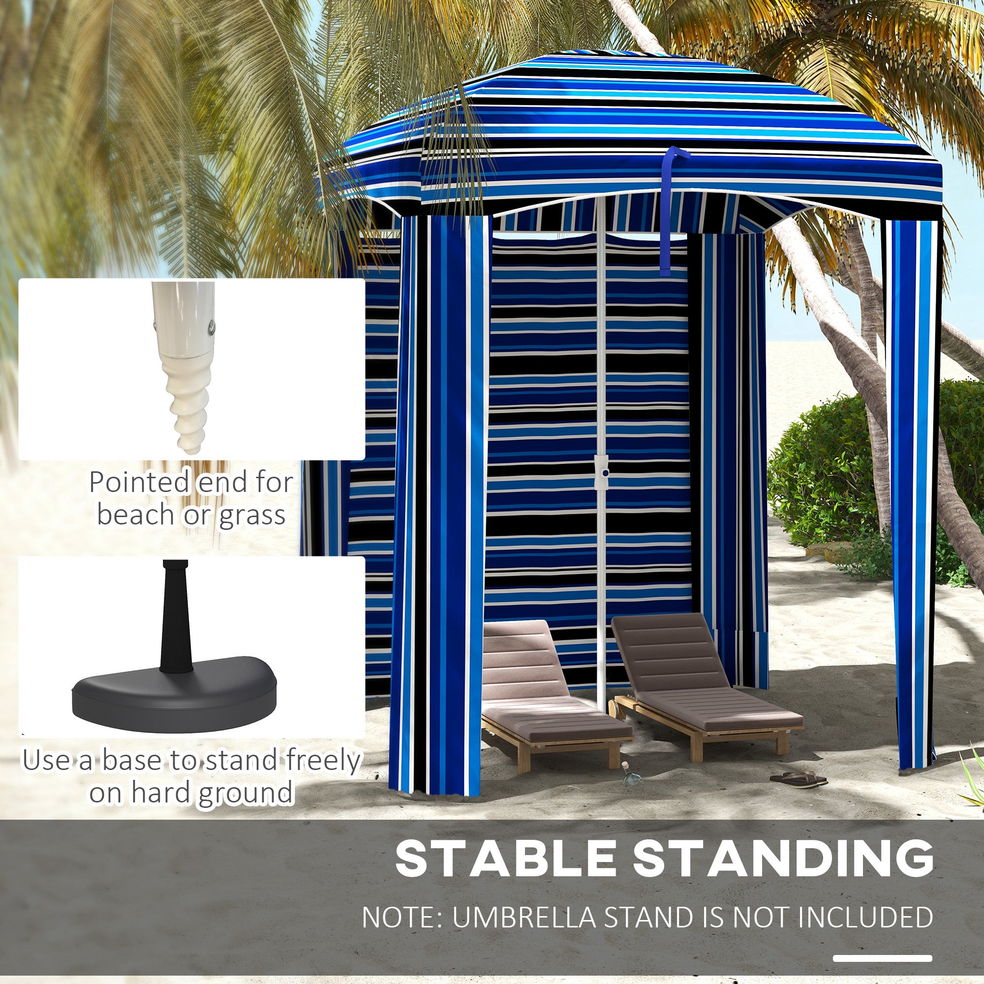 • 5.9' x 5.9' Portable Beach Umbrella, Ruffled Outdoor Cabana with Walls, Vents, Sandbags, Carry Bag, Blue Stripe