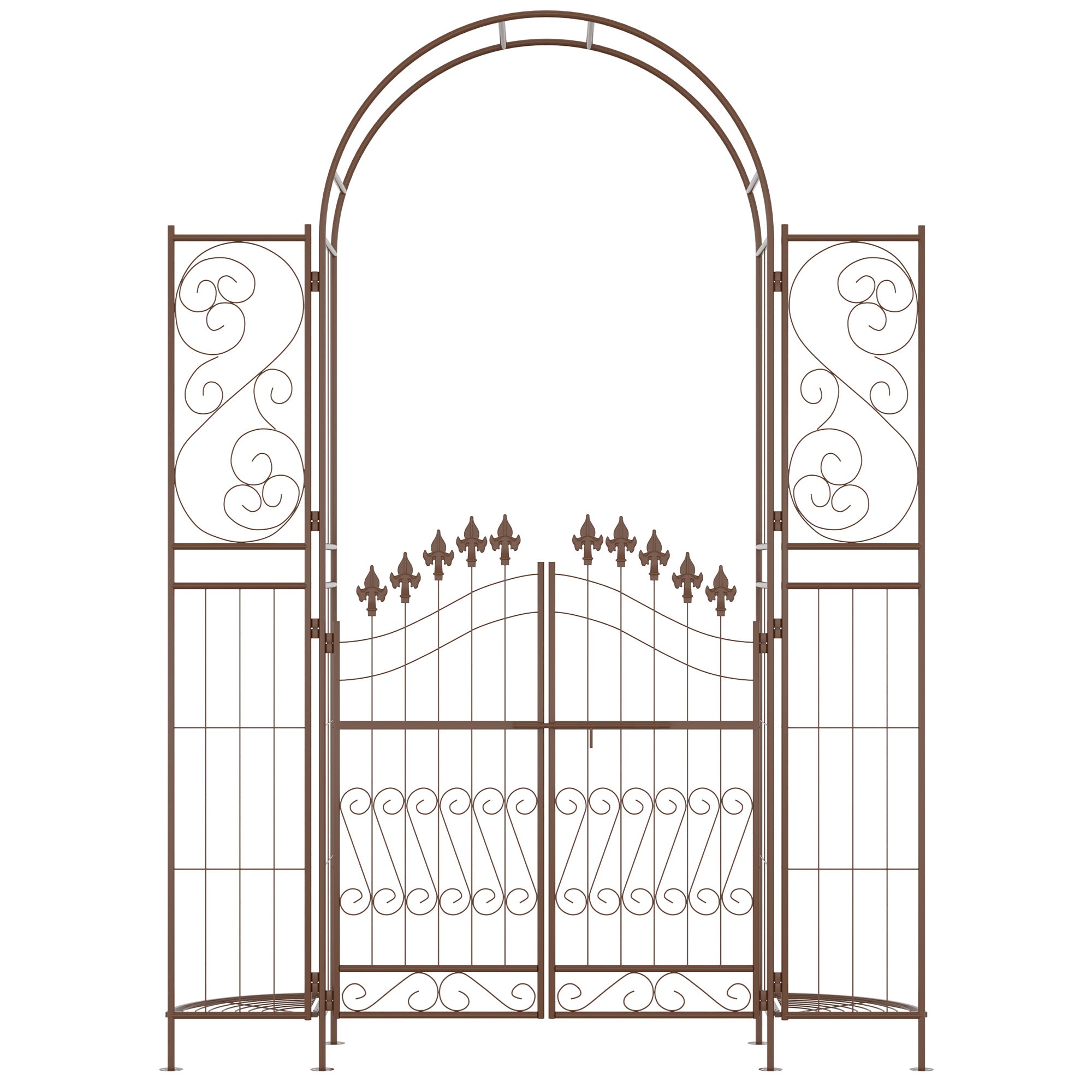 7' Metal Garden Arbor, Garden Arch with Gate, Fleur De Lis Motif, Latching Doors, Planter Shelves for Climbing Vines, Ceremony, Weddings, Party, Garden, Backyard, Lawn, Brown