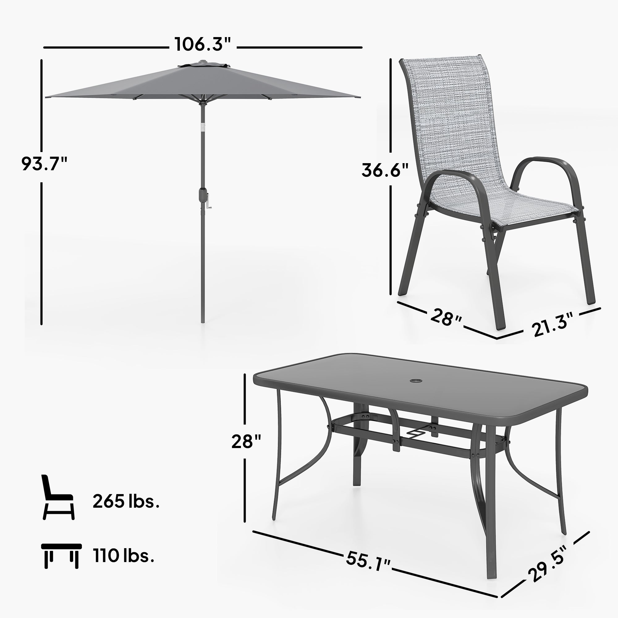 - Patio Dining Set with Umbrella Info: Table dimensions: 55.1" L x 29.5" W x 28" H. Chair dimensions: 21.25" W x 28" D x 36.5" H. Parasol dimensions: 106.25" Dia x 93.75" H. Weight capacity: 264 lbs. (Chair), 110 lbs. (Table). Assembly required