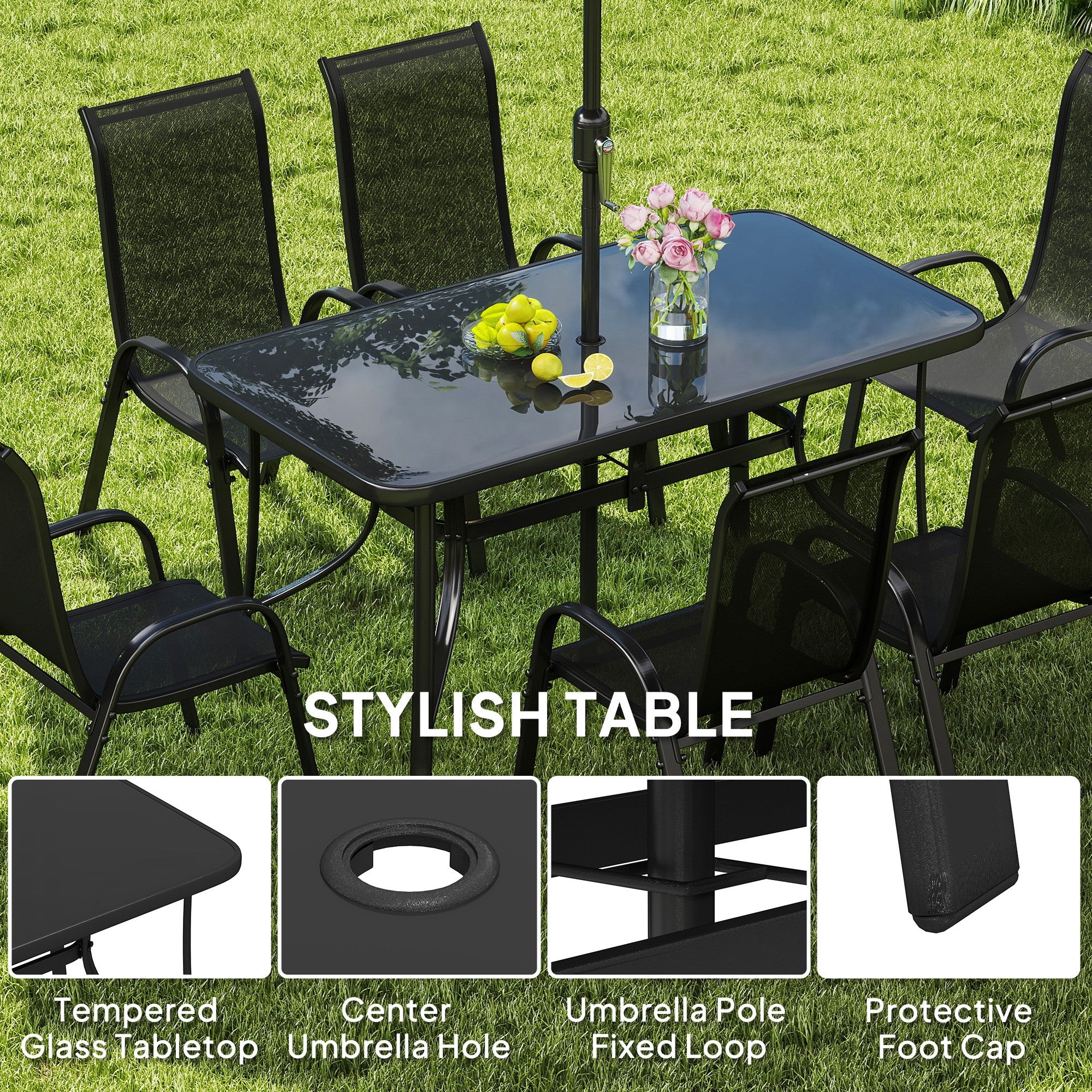 • 8 Pieces Patio Table and Chairs Set with 9 Ft Patio Umbrella, Outdoor Dining Set with 4.6 Ft Dining Table and 6 Chairs, Push Button Tilt and Crank Parasol, Tempered Glass Top, Black
