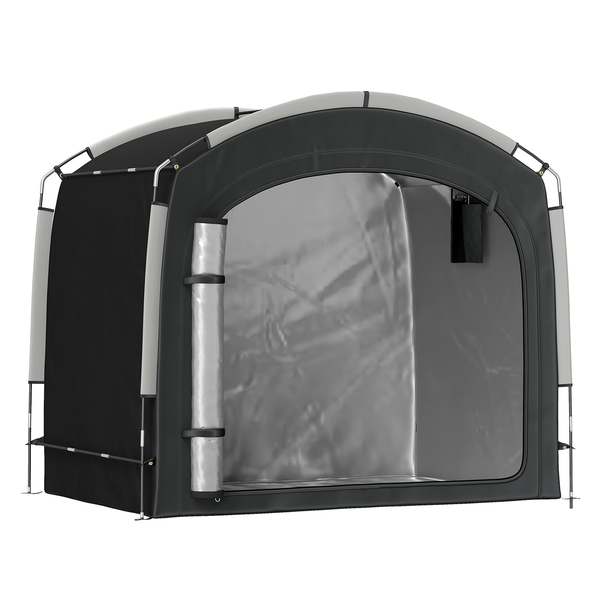 Discover the versatility of the Outsunny bike shed or motorcycle tent! Spacious enough to shelter 4 bikes or 2 motorcycles, this bicycle storage tent also houses your garden tools and seasonal decoration with ease. Crafted from 210D Oxford cloth with a silver coating for UPF50+ protection and seam-sealed waterproofing, it promises reliable coverage in a lightweight, easy-to-manage design.