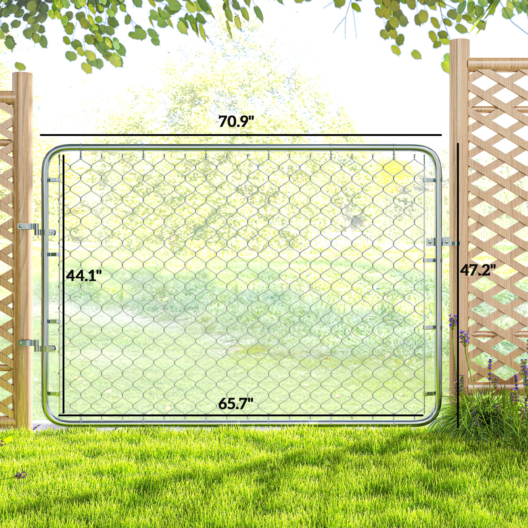 - Chain Link Gate Info: Overall Dimensions: 26"-70.9" W x 47.2" H; Wire Panel Dimensions: 65.7" W x 44.1" H; NOTE: Posts are required for installation (not included)