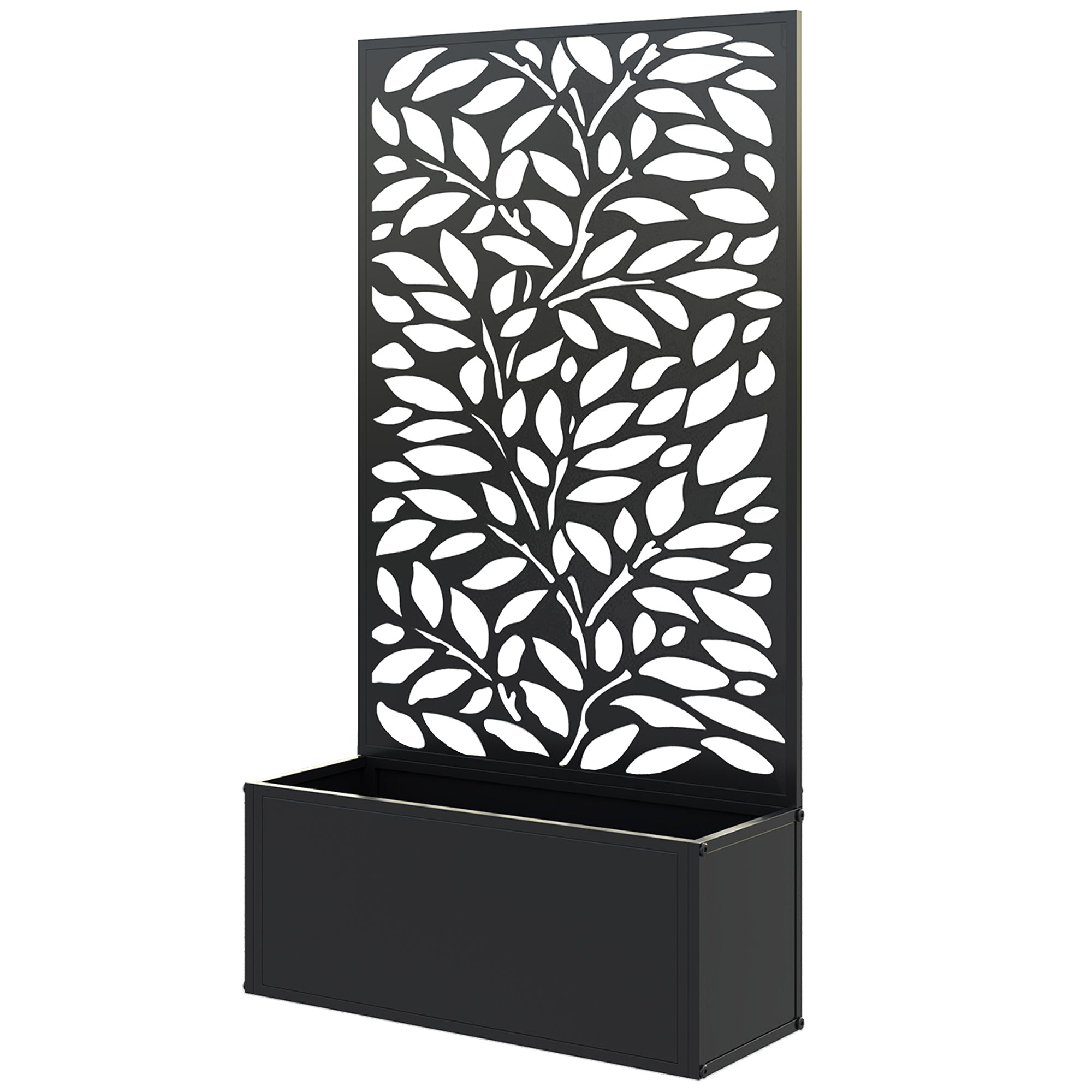 Transform your outdoor space with the Outsunny metal planter, featuring a privacy panel with leaves cut-out motifs. This metal garden planter boasts a spacious 22.8" L x 9.1" W x 9.4" H interior, great for nurturing plants in up to 8 gallons of soil. Its versatile design allows for wall mounting or freestanding setups, making it a charming addition to any garden.