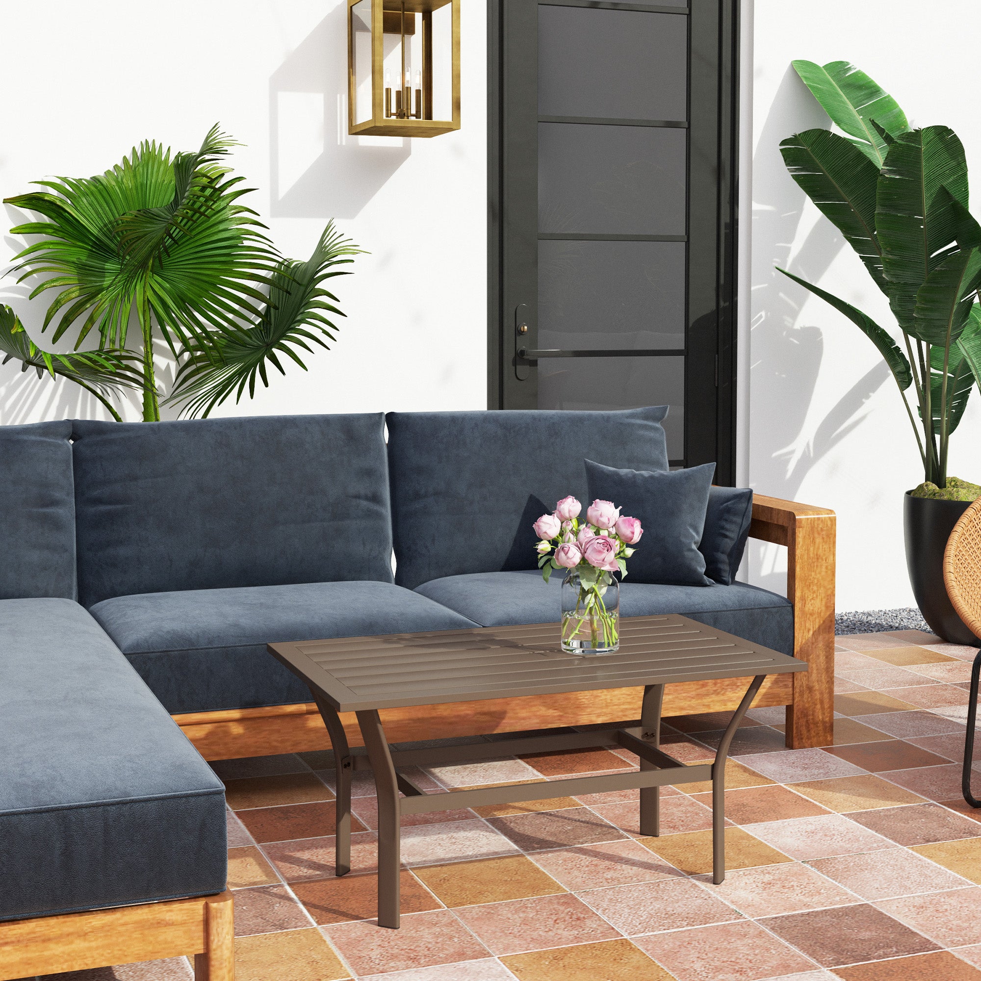 • Outdoor Coffee Table, All-Weather Rectangle Metal Patio Coffee Table with Slatted Tabletop for Outside, Patio, Garden, Balcony, Backyard, Brown