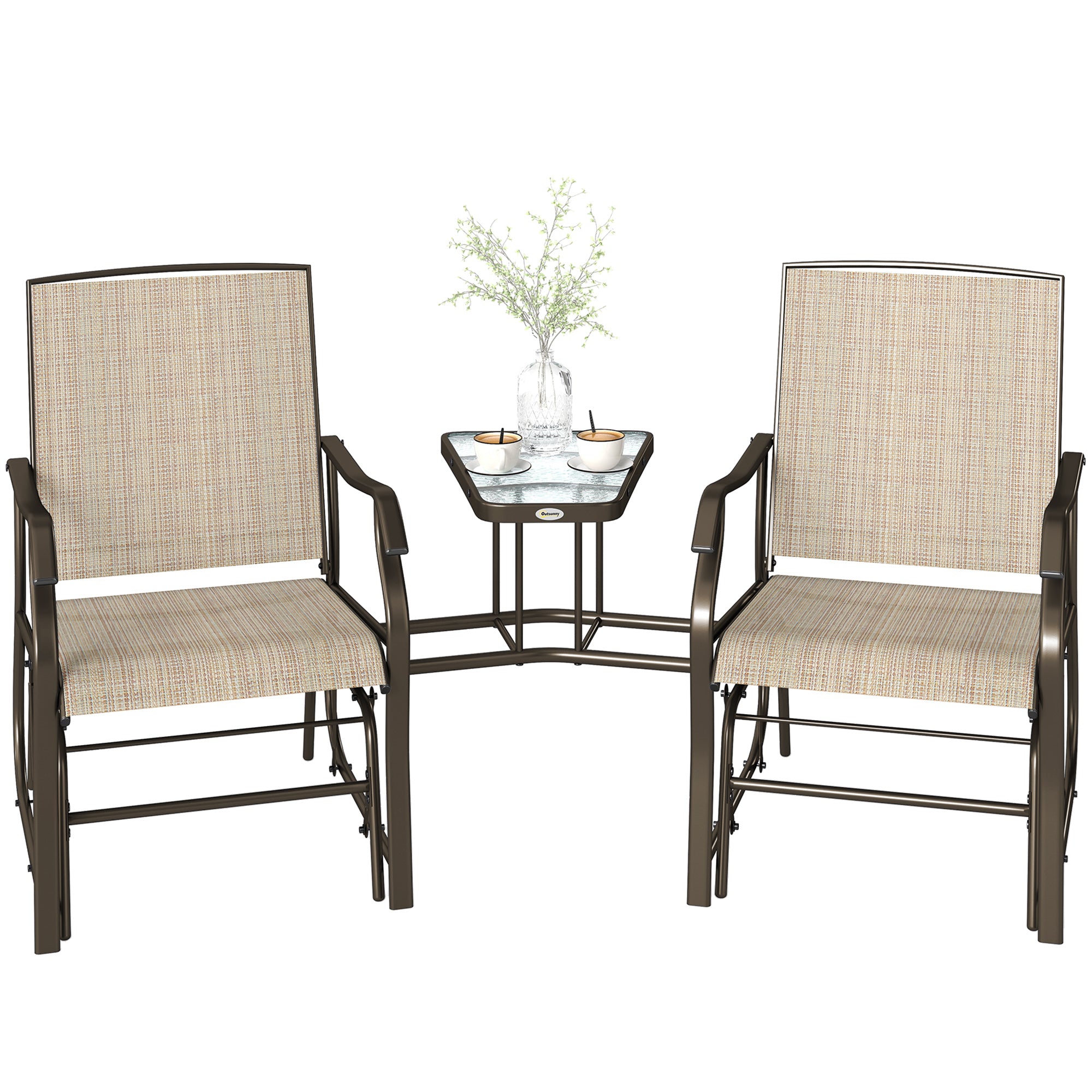 3 Piece Outdoor Glider Chair with Coffee Table Bistro Set, 2 Patio Rocking Swing Chairs with Breathable Sling Fabric, Glass Tabletop, for Backyard, Garden and Porch, Mixed Brown