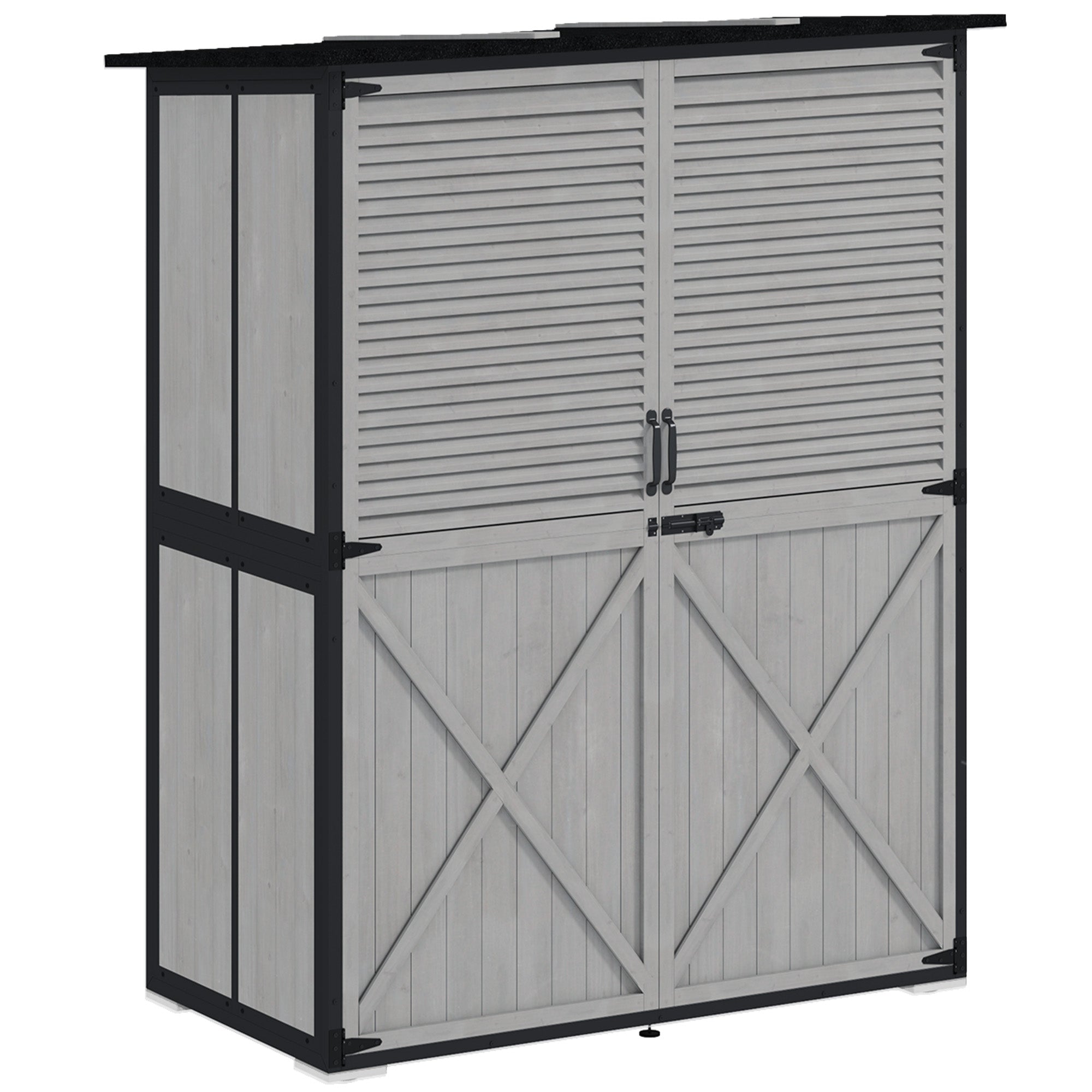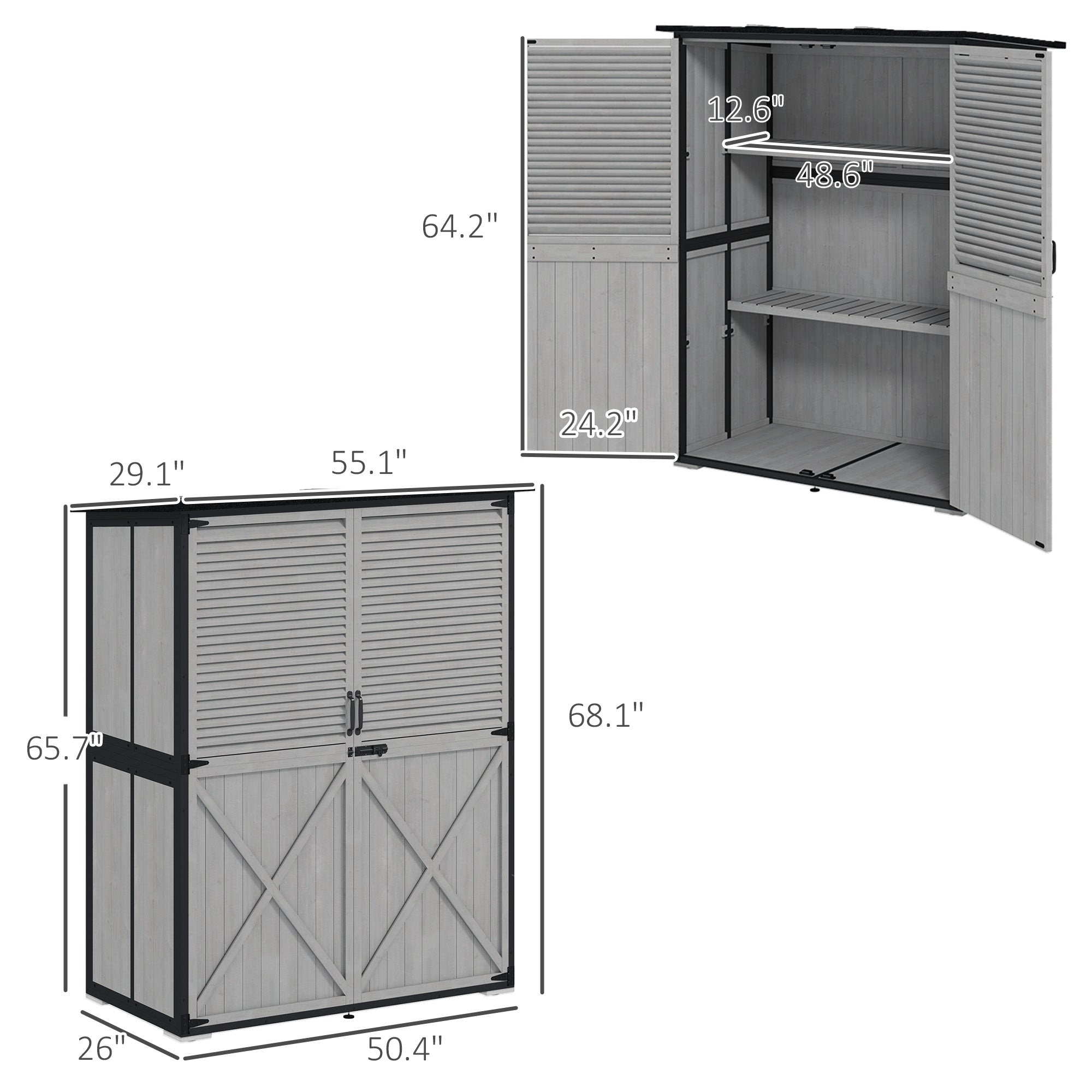 • Outdoor Storage Cabinet, Wood Garden Tool Shed with Lock, Steel Frame and Asphalt Roof, Garden Storage Shed with Adjustable Shelves and Feet for Patio Backyard Lawn, Gray