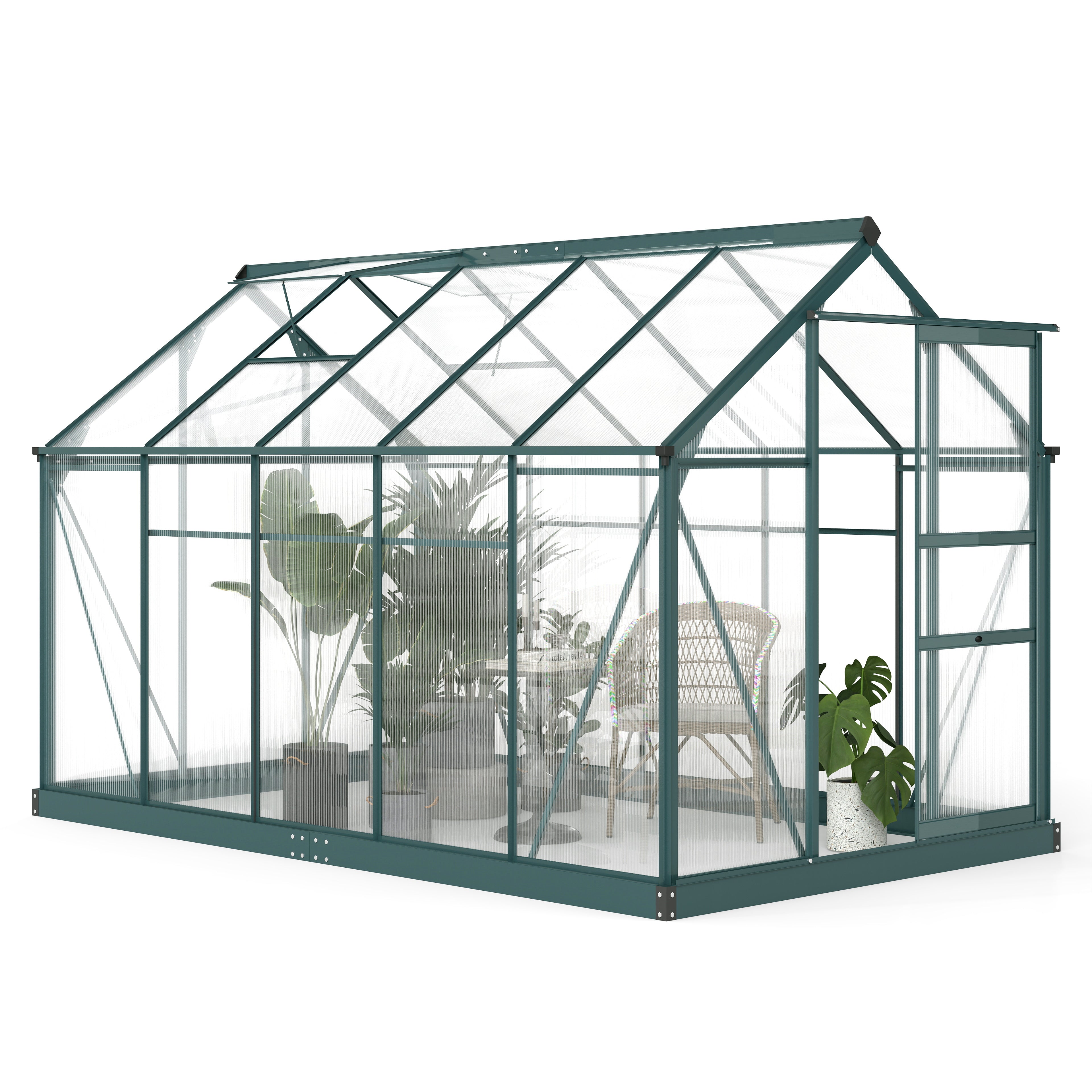 - Polycarbonate Greenhouse: Elevating humidity with superior insulation, transparent polycarbonate panels make our greenhouse ready for outside conditions. They allow in nourishing sunlight while still blocking scorching UV.