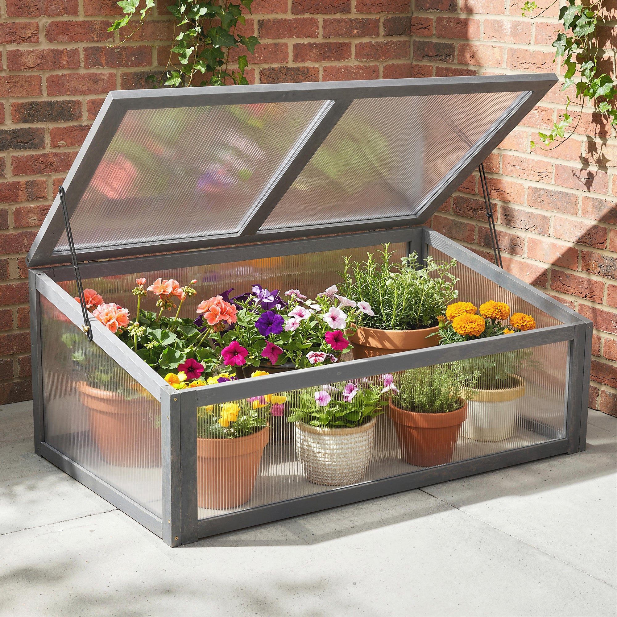 • Cold frame with potted plants against a brick wall