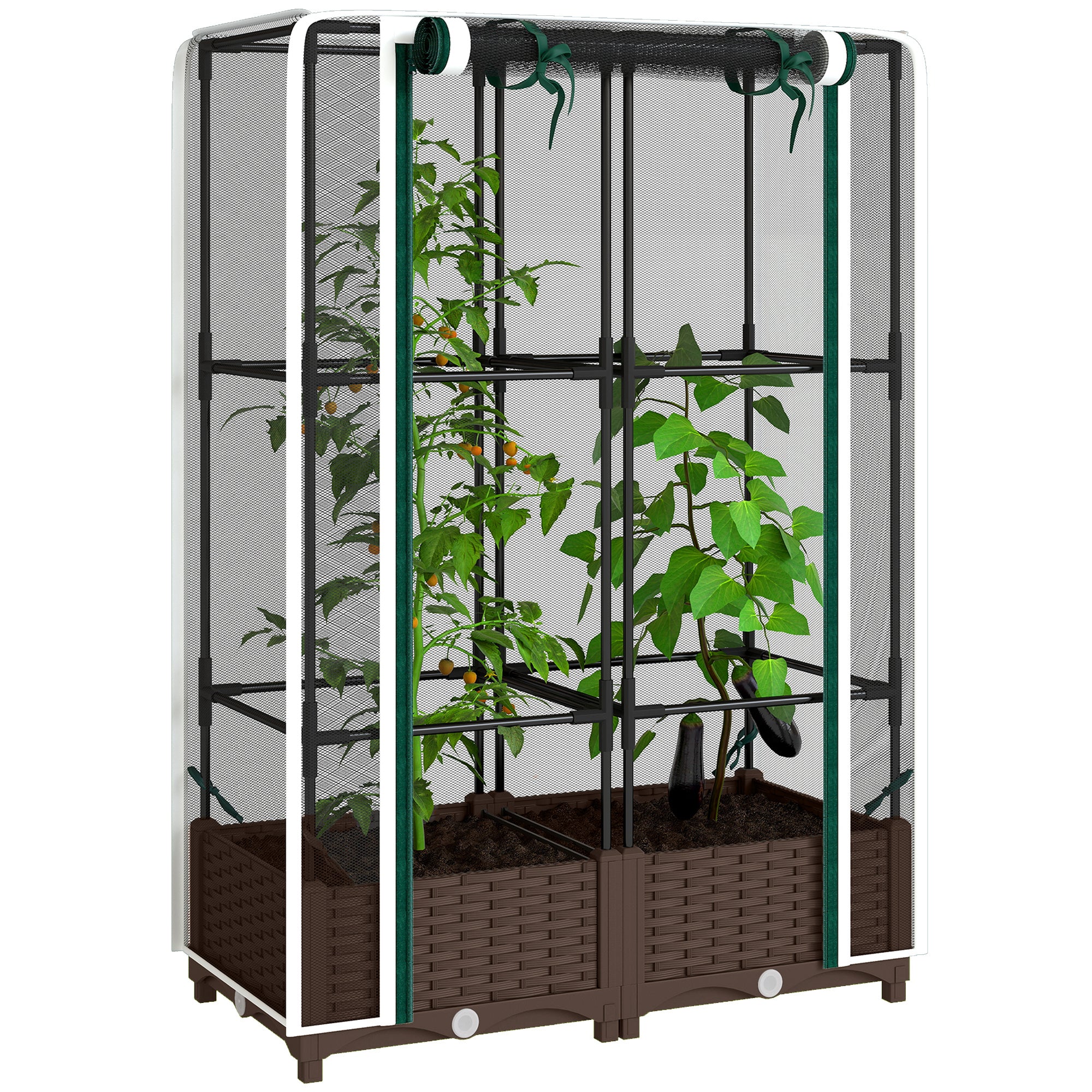 The Outsunny raised garden bed with trellis provides strong vertical support for tomatoes, peas, peppers, and more, helping plants grow upward like a tomato cage. Its ventilated mesh cover keeps unwanted guests out while allowing airflow. A built-in water reservoir maintains soil moisture with less daily watering, and the stable PP frame assembles easily for long-lasting outdoor use.