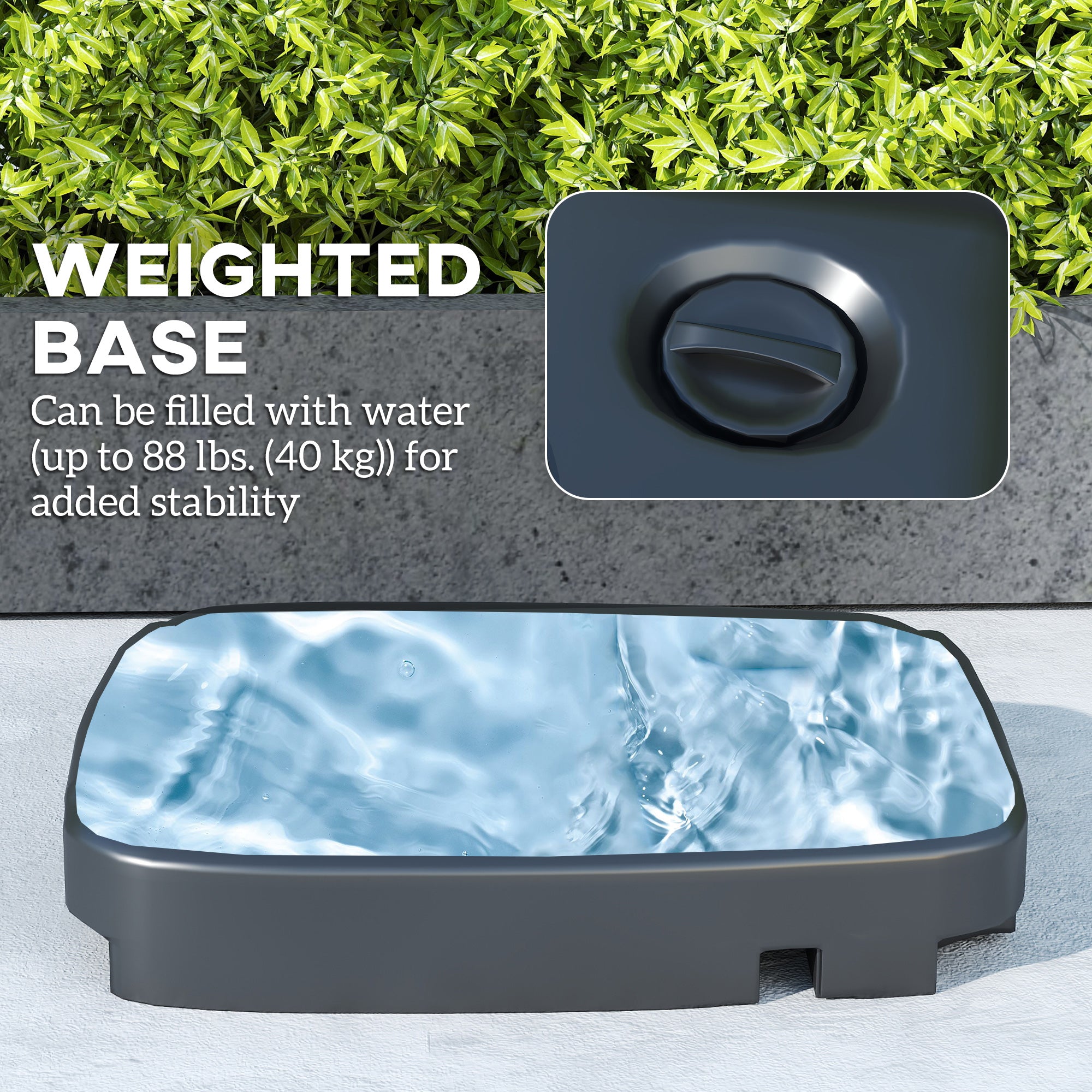 - Weighted Base Included: Ensures the overhanging parasol stays in place and can be filled with water (up to 88 lbs (40 kg)) for added stability