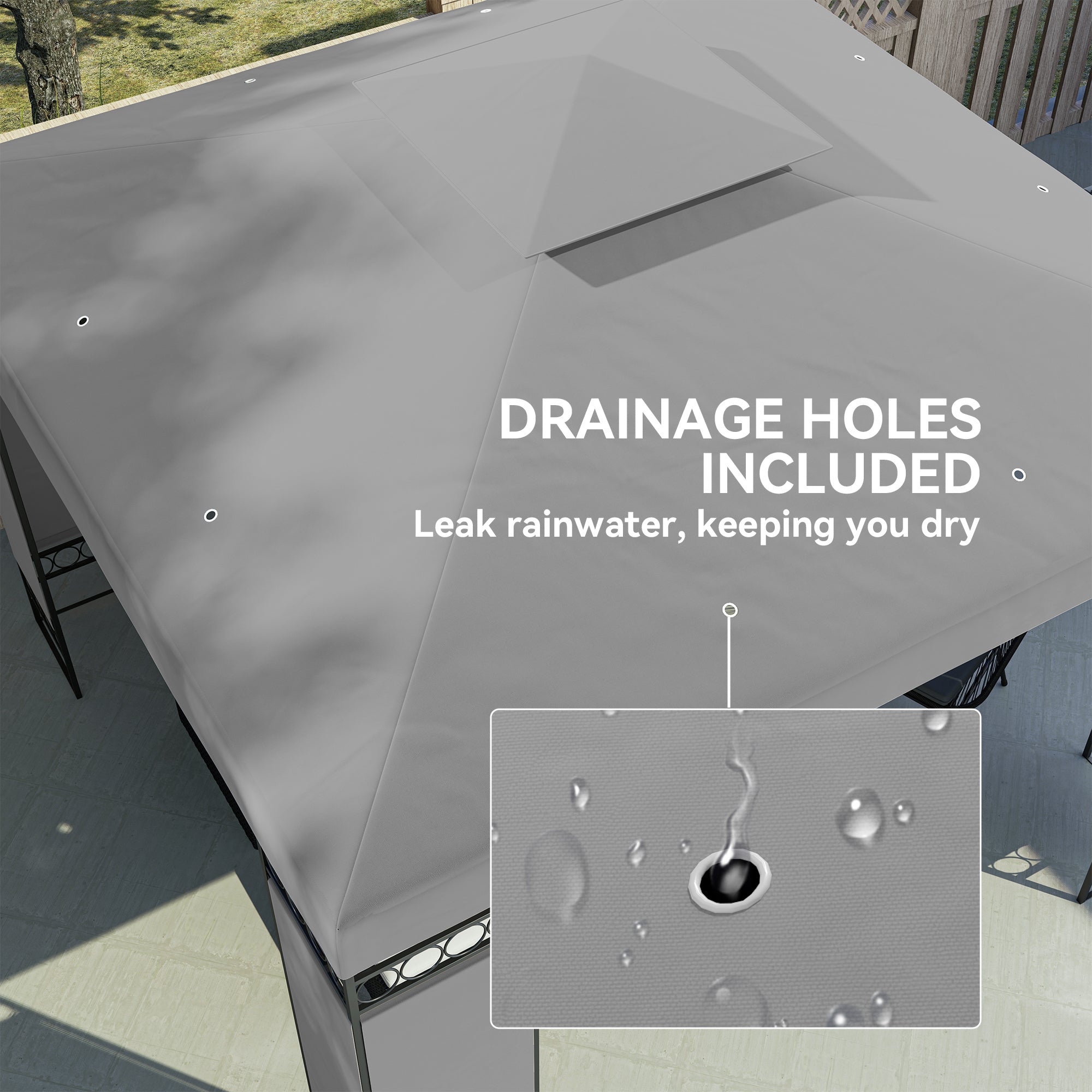 Transform your backyard into a serene getaway with the Outsunny soft top gazebo! Its double-top design enhances air flow, ensuring a cool retreat on hot days, while the splash-resistant polyester canopy with drainage holes effortlessly sheds rainwater. This spacious deck gazebo comfortably fits 10 people, making it the desired addition to your patio, deck, or garden.