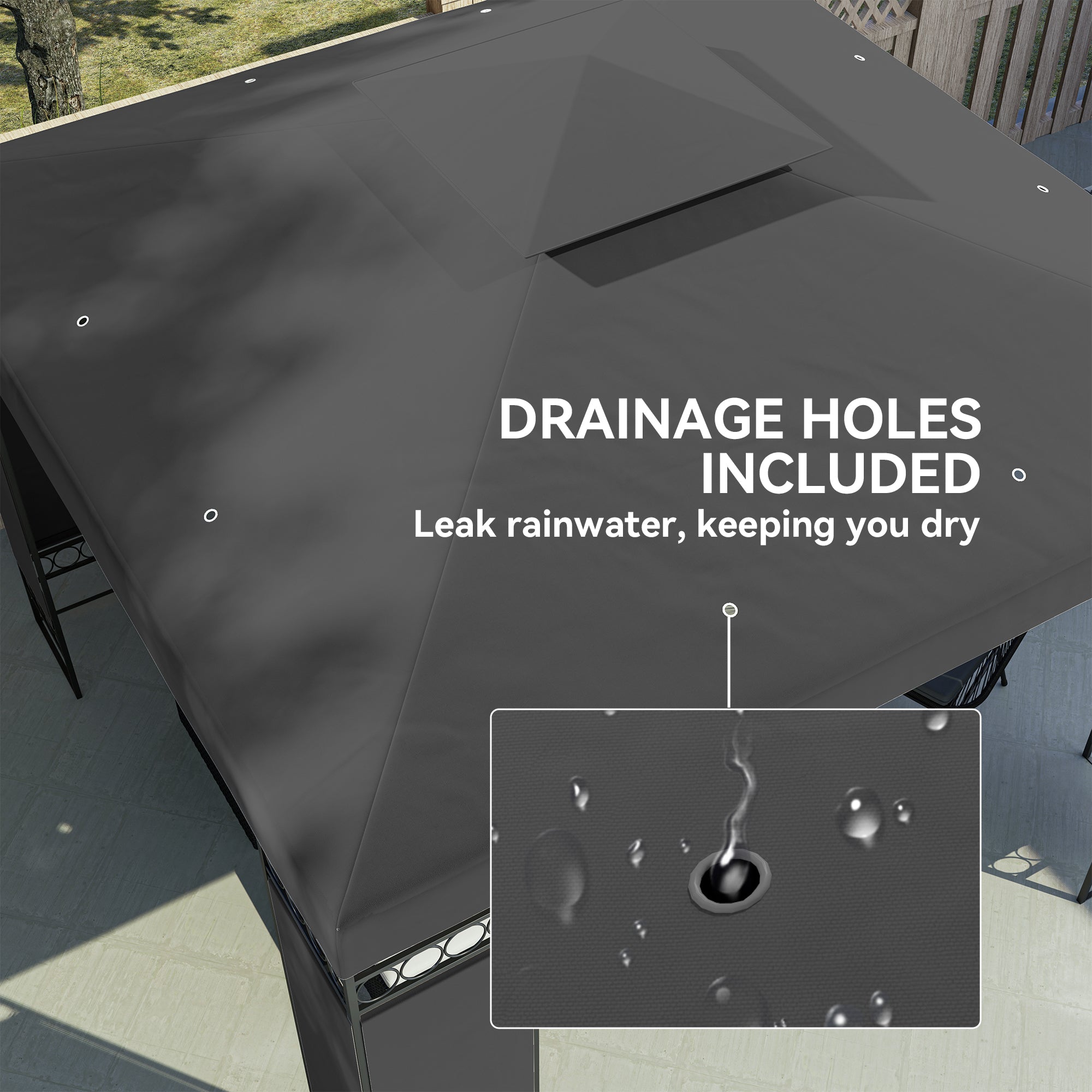 Transform your backyard into a serene getaway with the Outsunny soft top gazebo! Its double-top design enhances air flow, ensuring a cool retreat on hot days, while the splash-resistant polyester canopy with drainage holes effortlessly sheds rainwater. This spacious deck gazebo comfortably fits 10 people, making it the desired addition to your patio, deck, or garden.