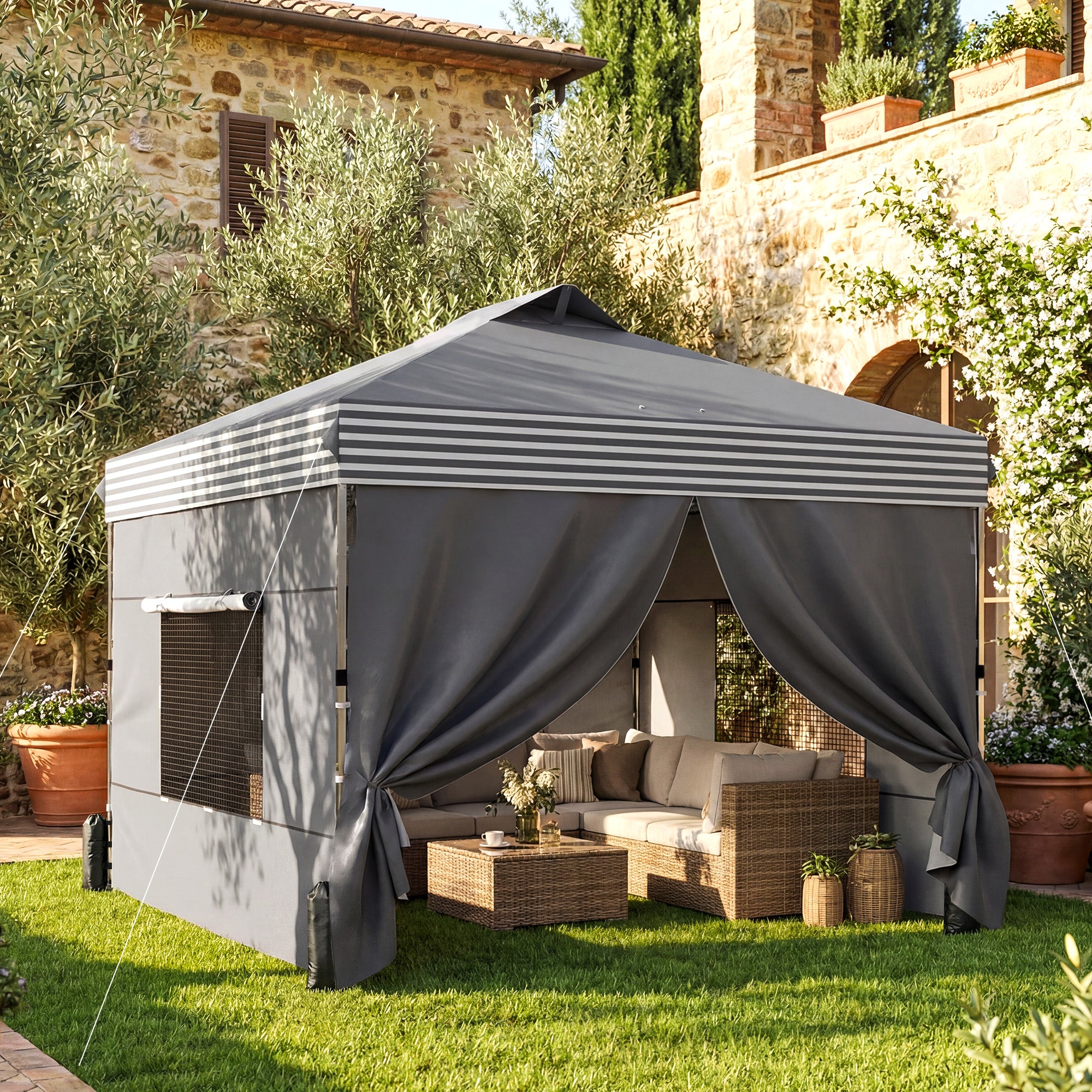 - Effortless Setup: The practical pop-up structure with a one-push central lock allows you to set up this 9.8 x 9.8 ft (3 x 3 m) camping gazebo in about 30 minutes—no tools needed. Fold it for easy storage and carrying with the wheeled carry bag