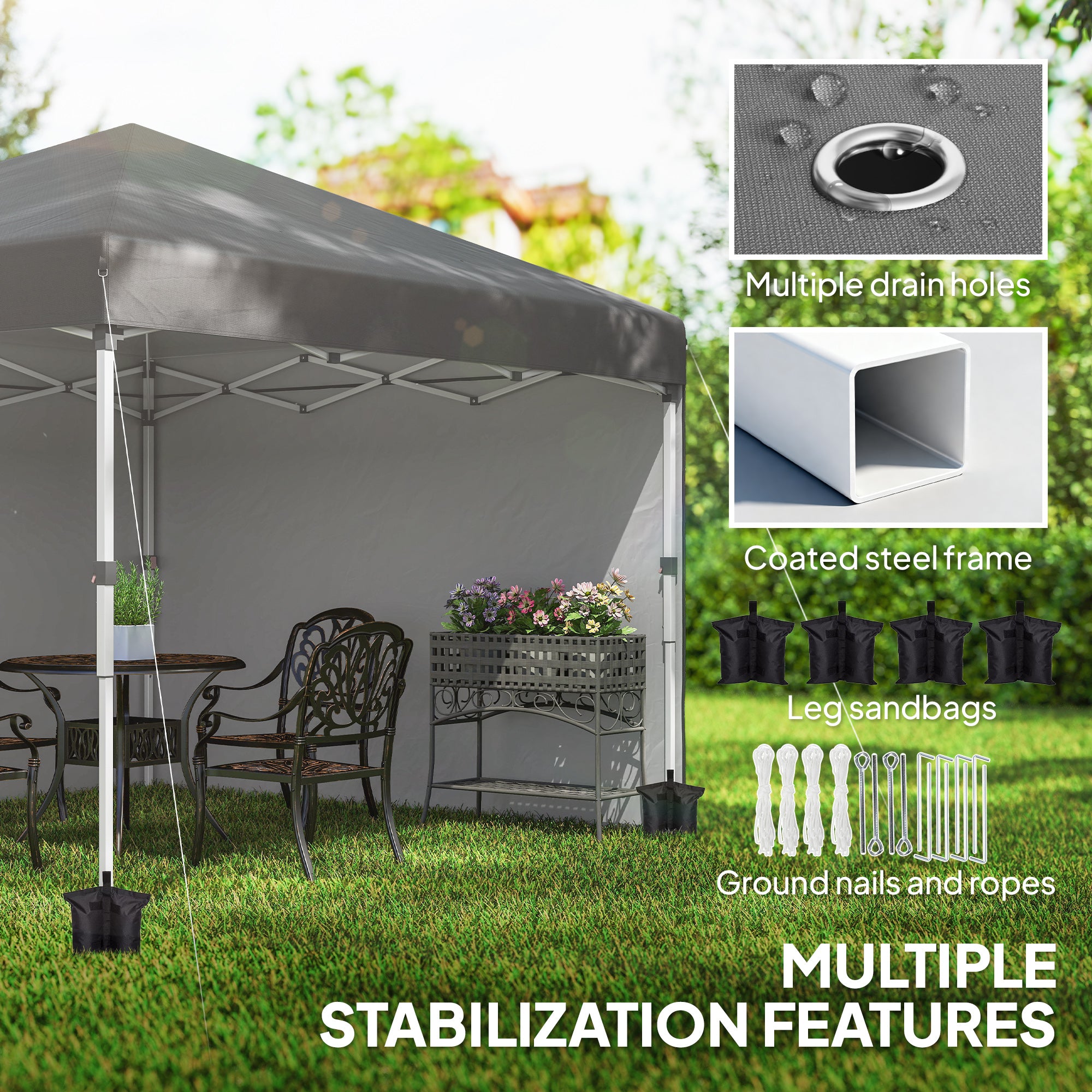- Robust Stabilization Settings: This camping canopy includes ground nails, ropes and 4-leg sandbags for secure setup on soft ground. Drain holes reduce water buildup, while the coated steel frame provides reliable stability.