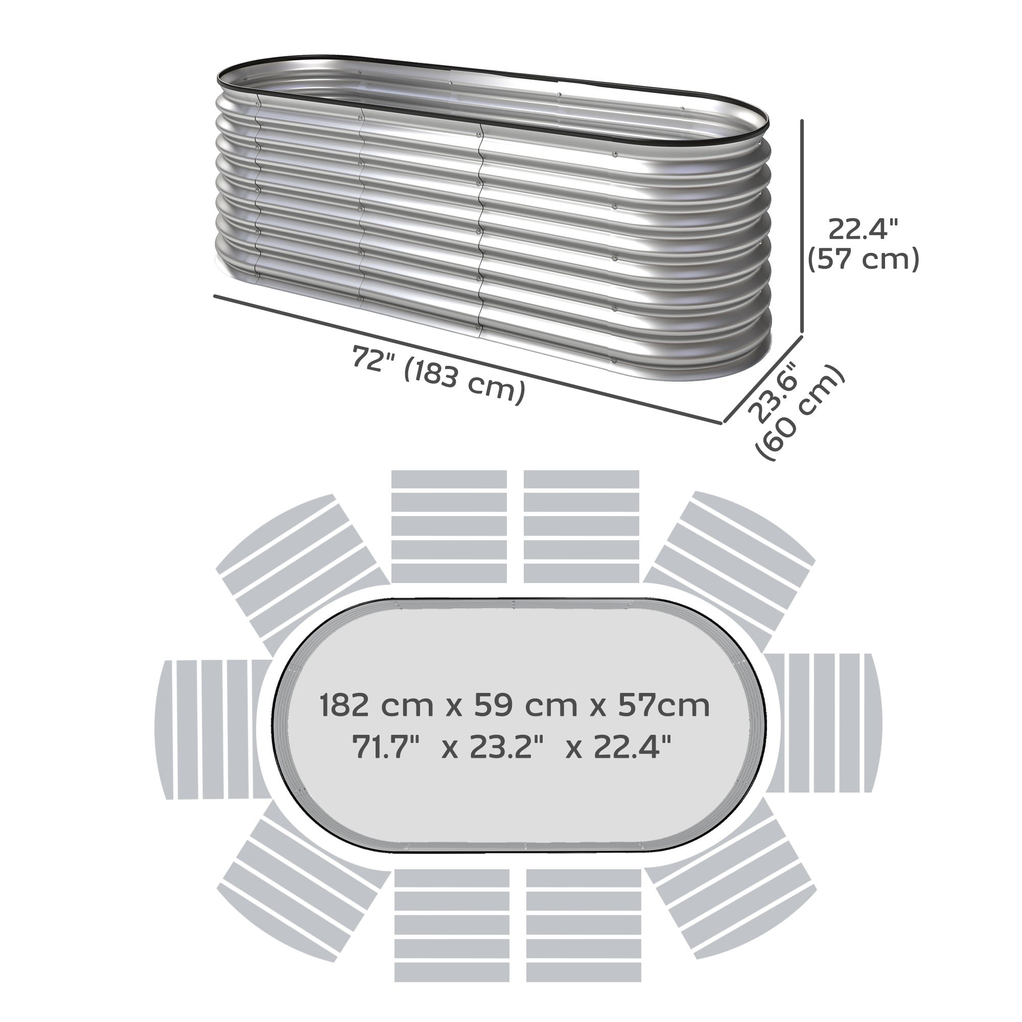 - Planting Area Dimensions: 71.7" L x 23.2" W x 22.4" H (182 x 59 x 57 cm);