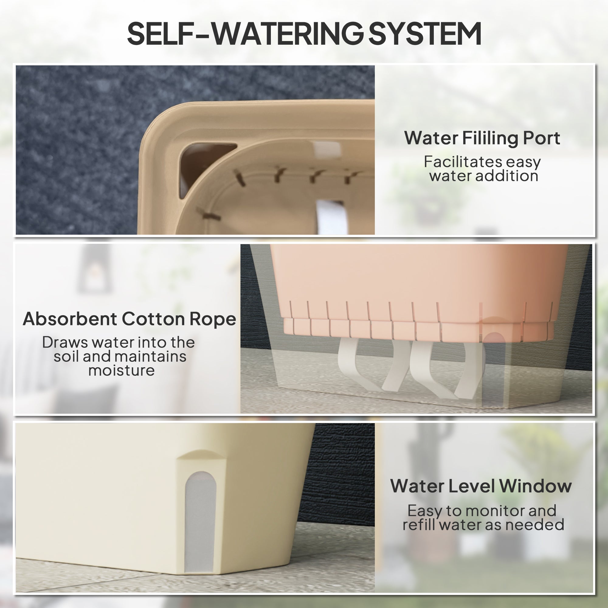 - Viewing Window: Equipped with a water inlet and a visible water level window, these garden pots allow you to effortlessly monitor water intake, making plant care easier and ensuring your plants stay perfectly hydrated.