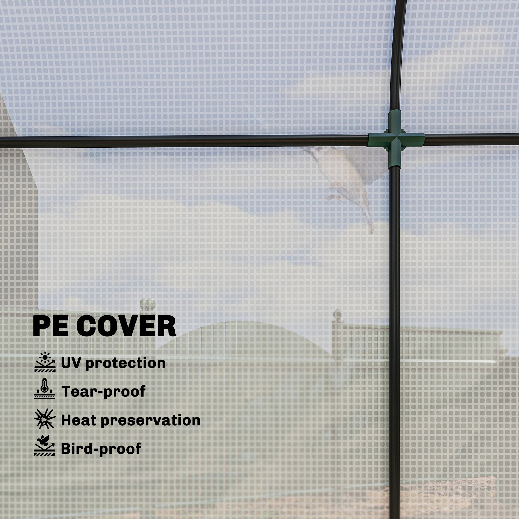 Tired of unpredictable weather and unwanted guests threatening your garden? The Outsunny greenhouse eases your worries. Its galvanized steel frame ensures stability, while the protective PE cover creates a nurturing microclimate. Roll-up door is great for ventilating and managing your plants. With its ventilated mesh windows, your plants can thrive in this secure sanctuary. Great for every green thumb looking for a greenhouse to cultivate their garden polytunnel paradise!