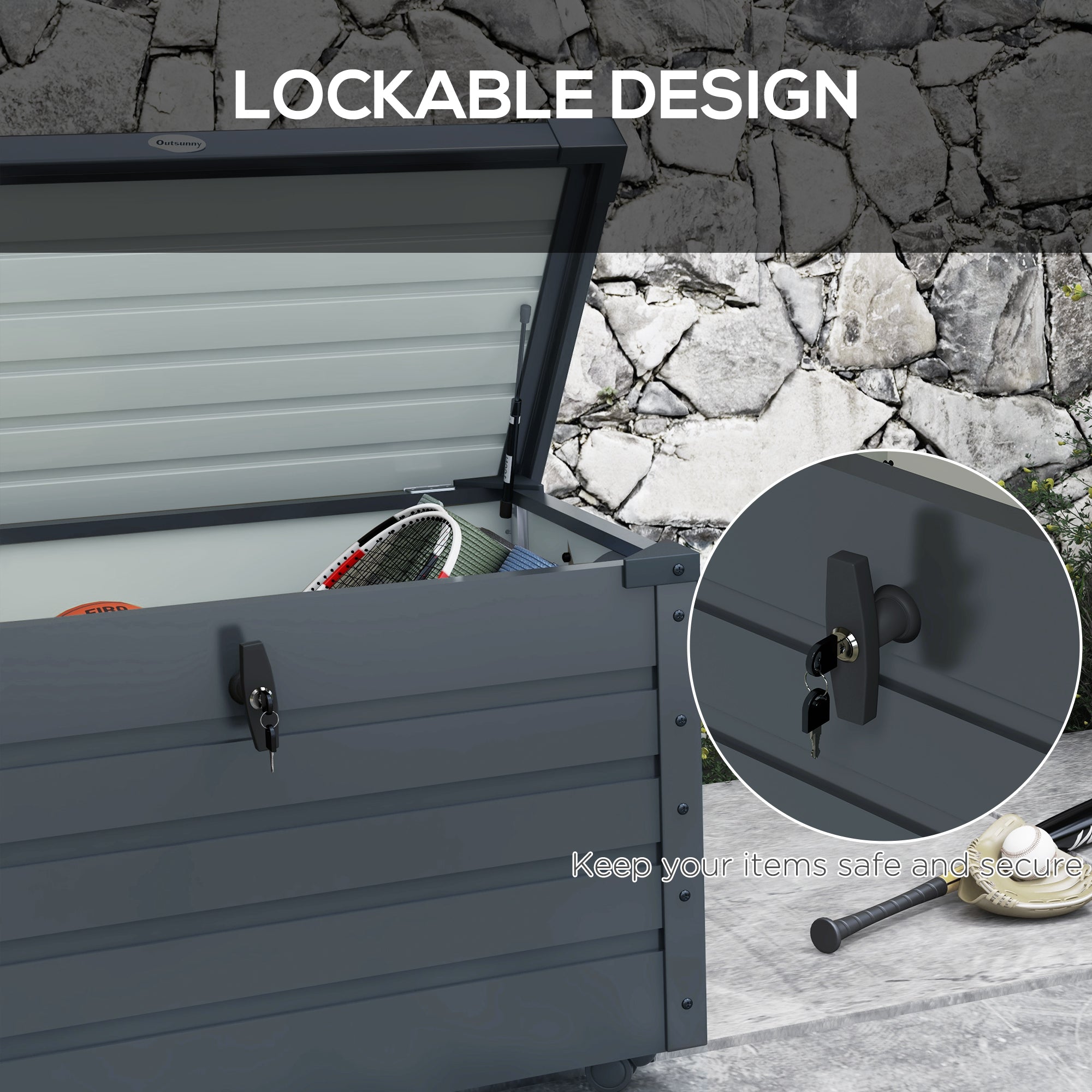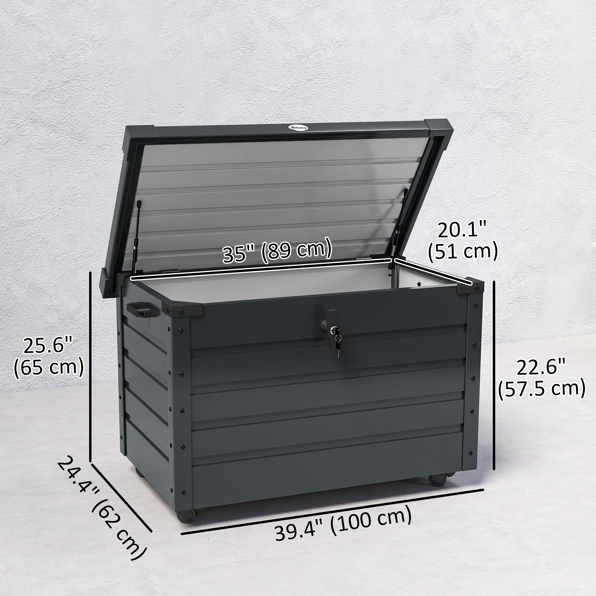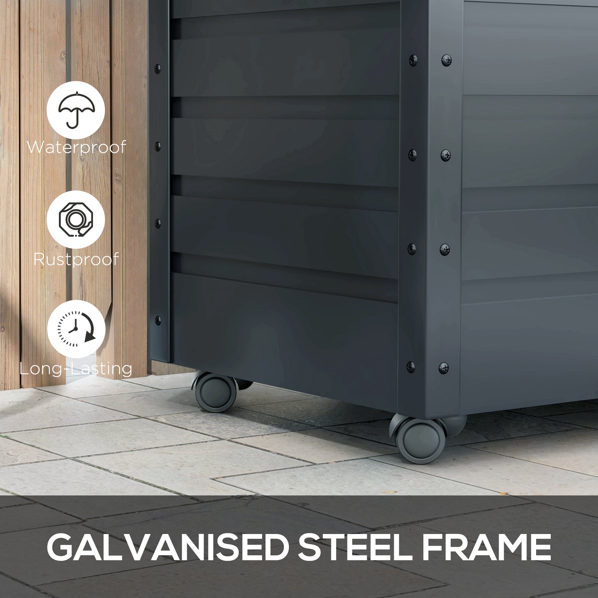 • 78 Gallon Garden Storage Box, Waterproof Outdoor Storage Container with Wheels and Handles, Lockable Galvanised Steel Outside Deck Box for Tools, Cushions, Dark Grey