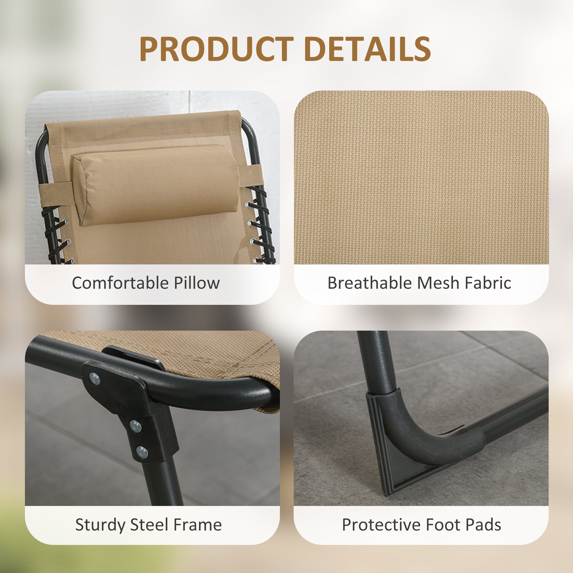 • Folding Lounge Chair, Reclining Tanning Chair, Portable Sun Lounger with Adjustable Backrest and Removable Pillow for Patio, Garden, Beach, Beige