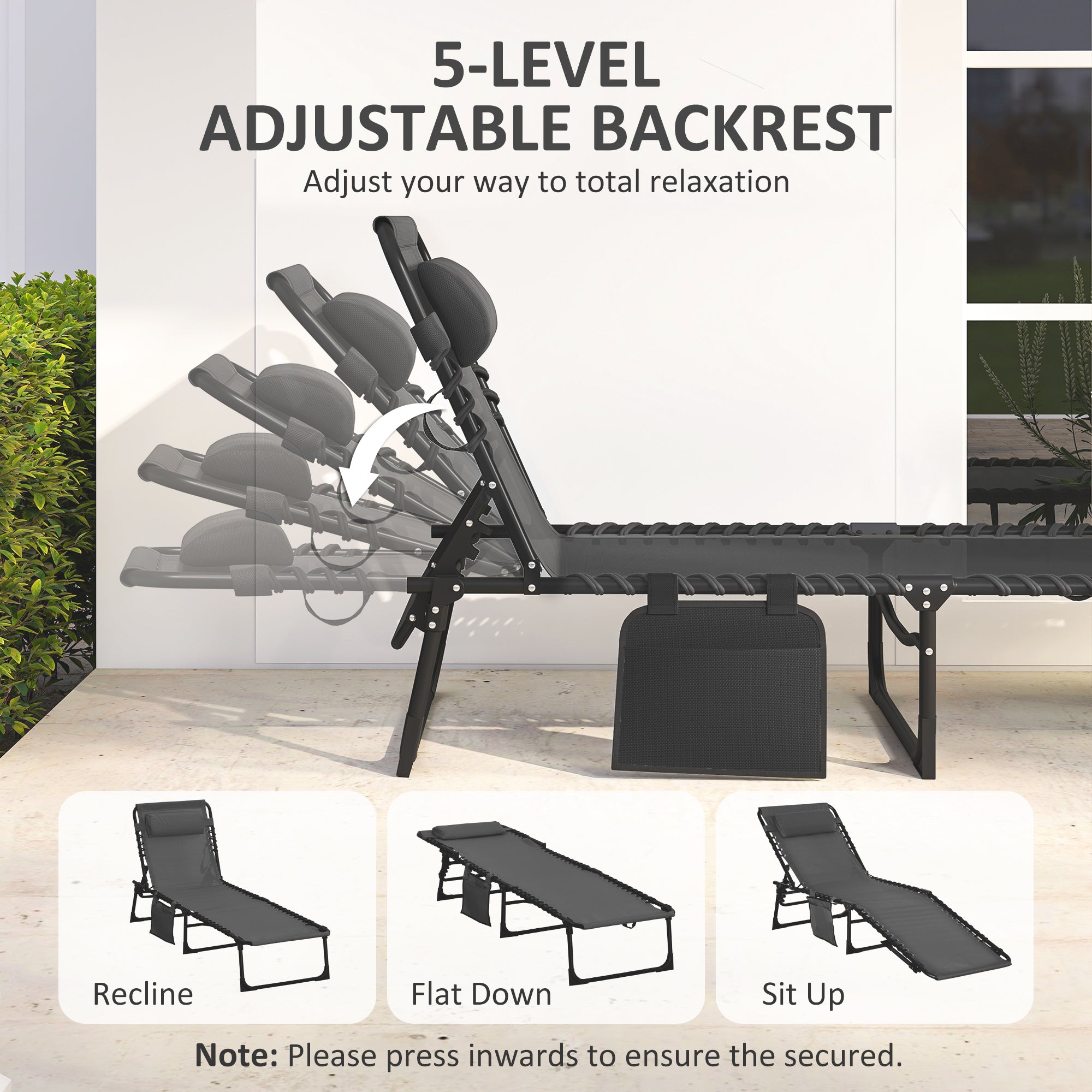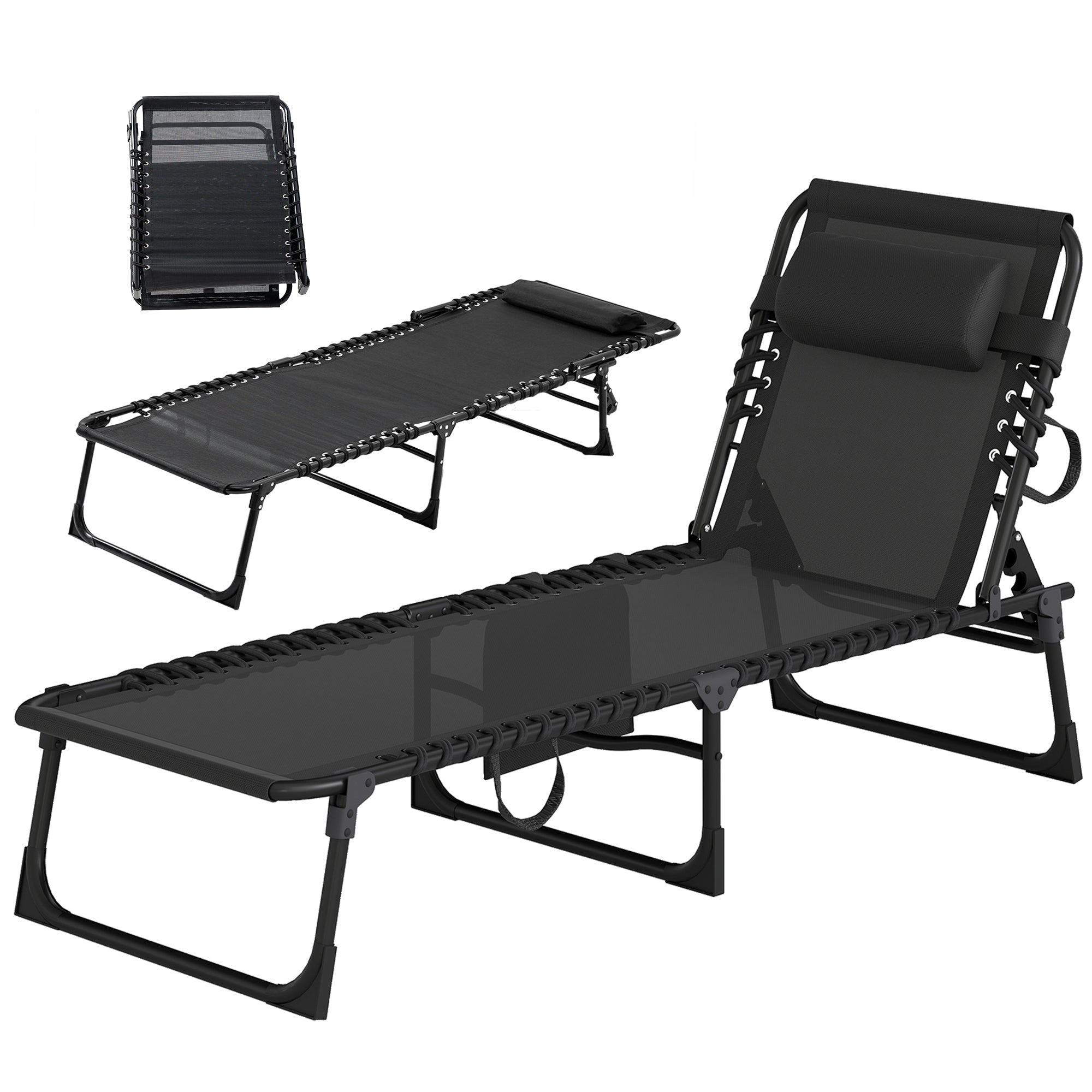 Outsunny's chaise lounge lets you relax outdoors in classic comfort. Adjust the back in 5 positions for optimal angles. The mesh seat is supported with bungees, conforming to your comfort. The included pillow is removable, serving as a headrest or lumbar support. Easily fold and store it after lounging on the deck. Fitting in the car quickly, our outdoor lounge chair is also excellent for weekend trips to the beach.