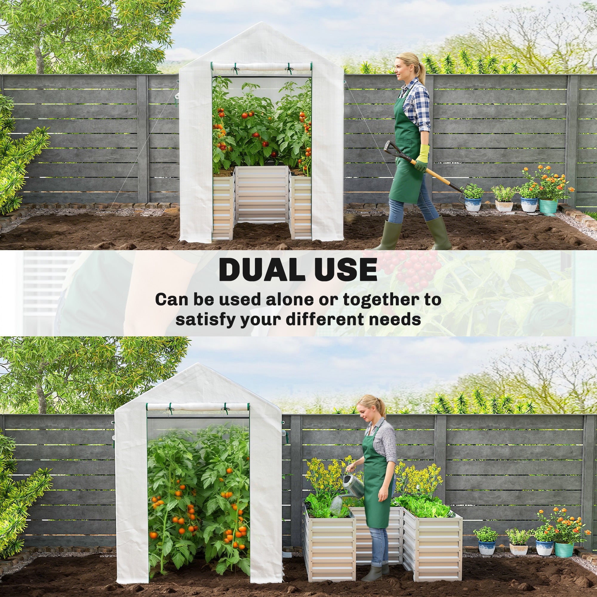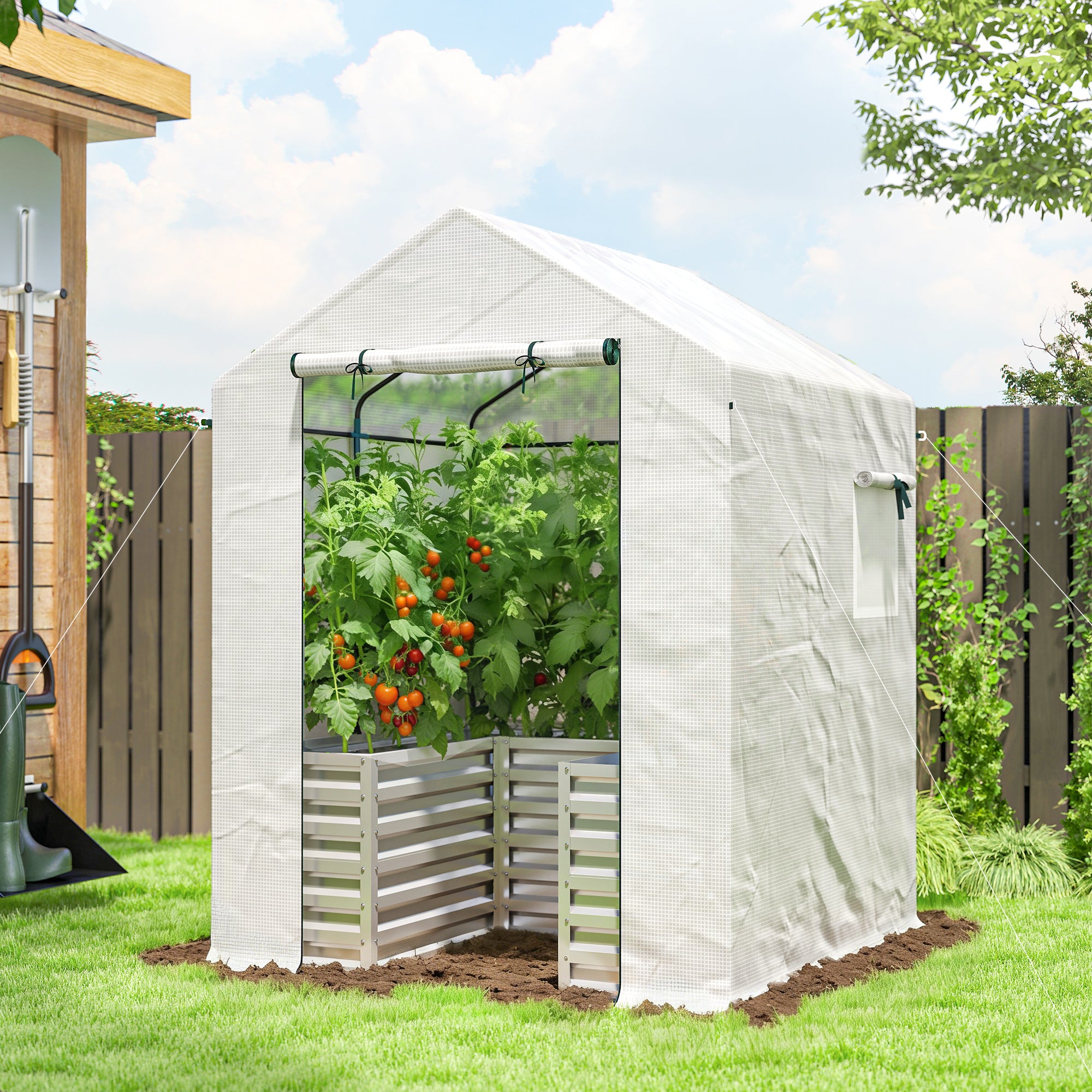 • Greenhouse with Raised Garden Bed, 56" x 56" x 75" Galvanized Metal Planter Box with PE Cover, Roll Up Door and Windows, Outdoor Greenhouse for Flowers Vegetables, White