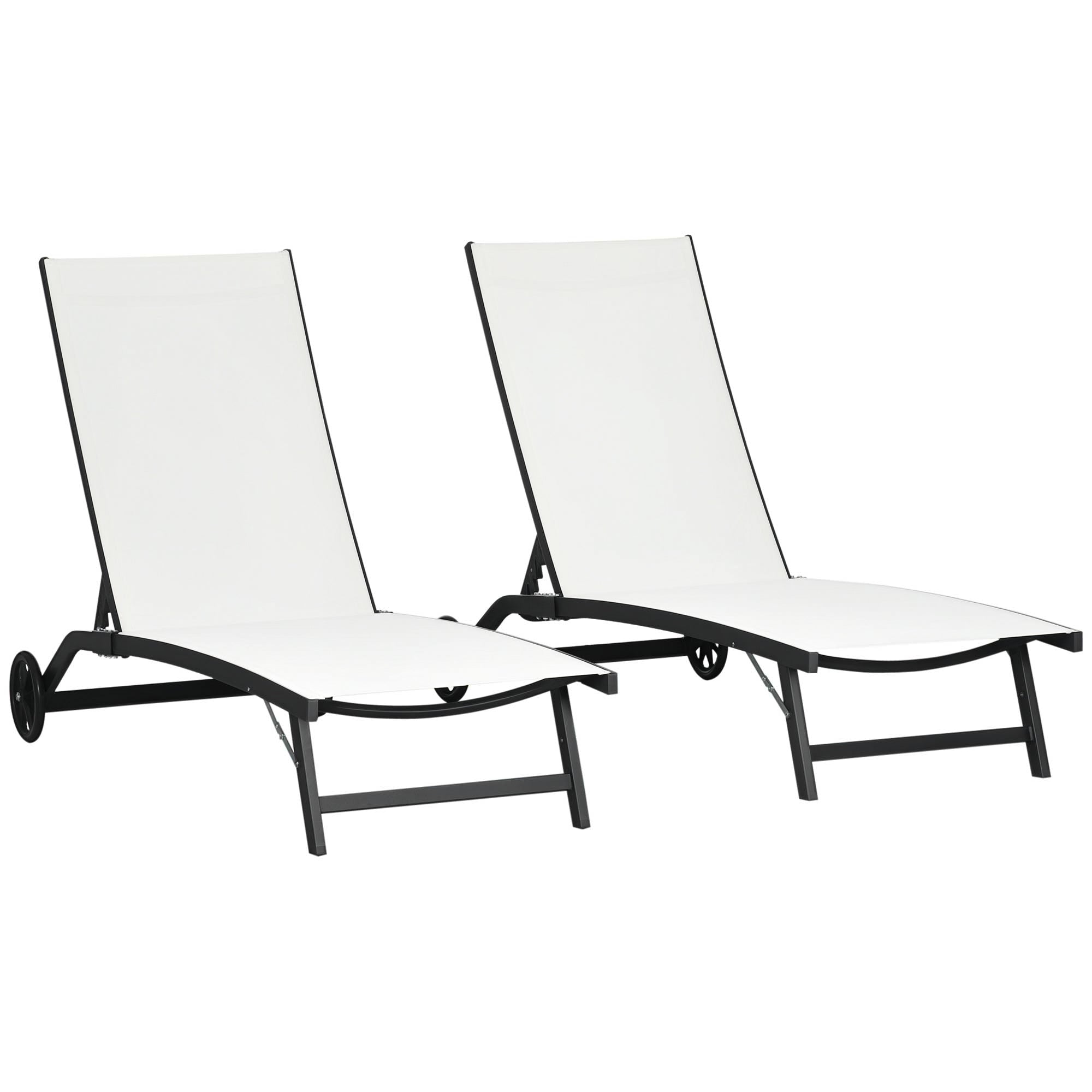 Lay the day away, your way with this Outsunny outdoor chaise lounge chair set. The beach lounger backrest can be set to different angles to a position you want. Powder-coated aluminum frames are strong enough to support you as you relax yet lightweight enough to move easily with two wheels. Cool off on hot days with the breathable mesh on the tanning lounger. So, sit down, sunbathe, take a nap, and enjoy peace and comfort with this outdoor lounger set!