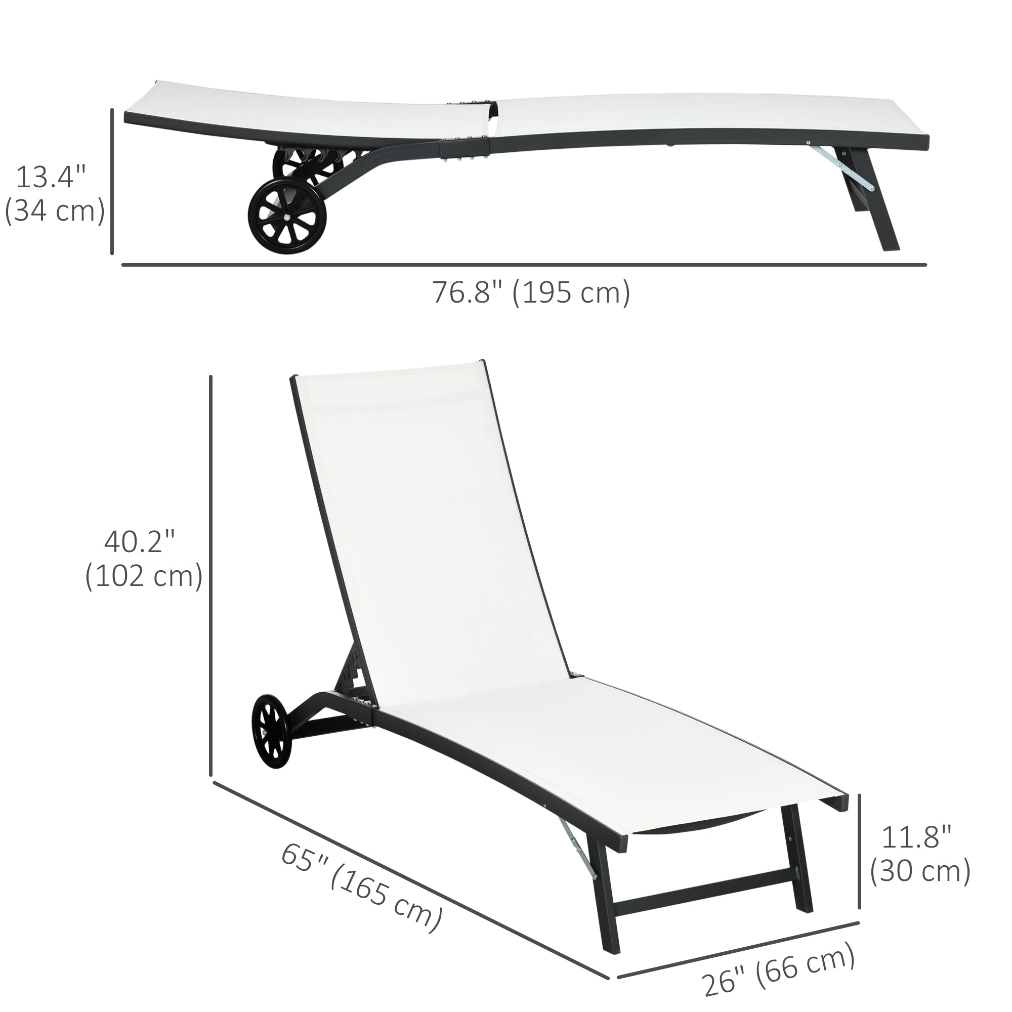 - Patio Lounge Chair Information: Reclining dimension: 26" W x 65" D x 40.2" H (66 x 165 x 102 cm). Lying dimension: (max. 175°) 76.8" L x 26" W x 13.4" H (195 x 66 x 34 cm). Maximum load: 330 lbs. (150 kg). Assembly required.