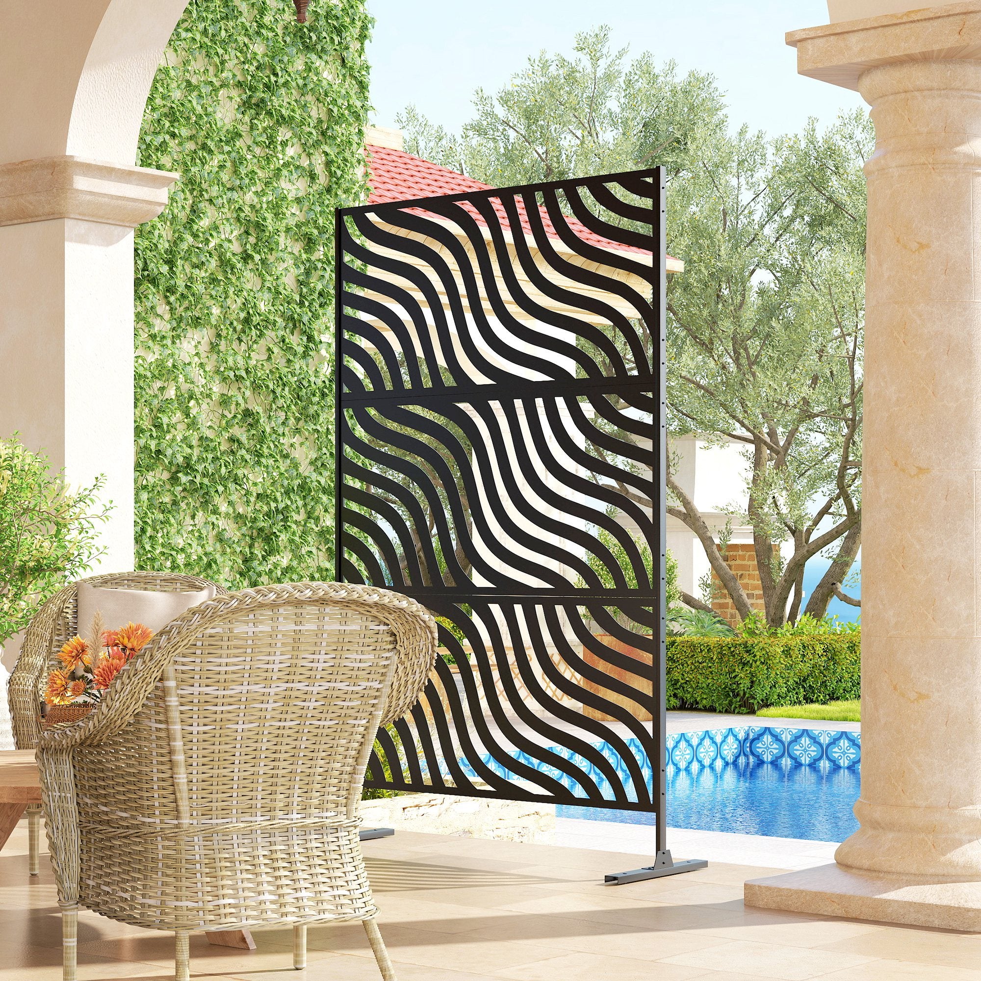 • Metal Outdoor Privacy Screen, 78" x 48" Freestanding Outdoor Divider with Stand, Decorative Privacy Panel with Ripple Cut-out Design for Garden Patio Backyard, Black