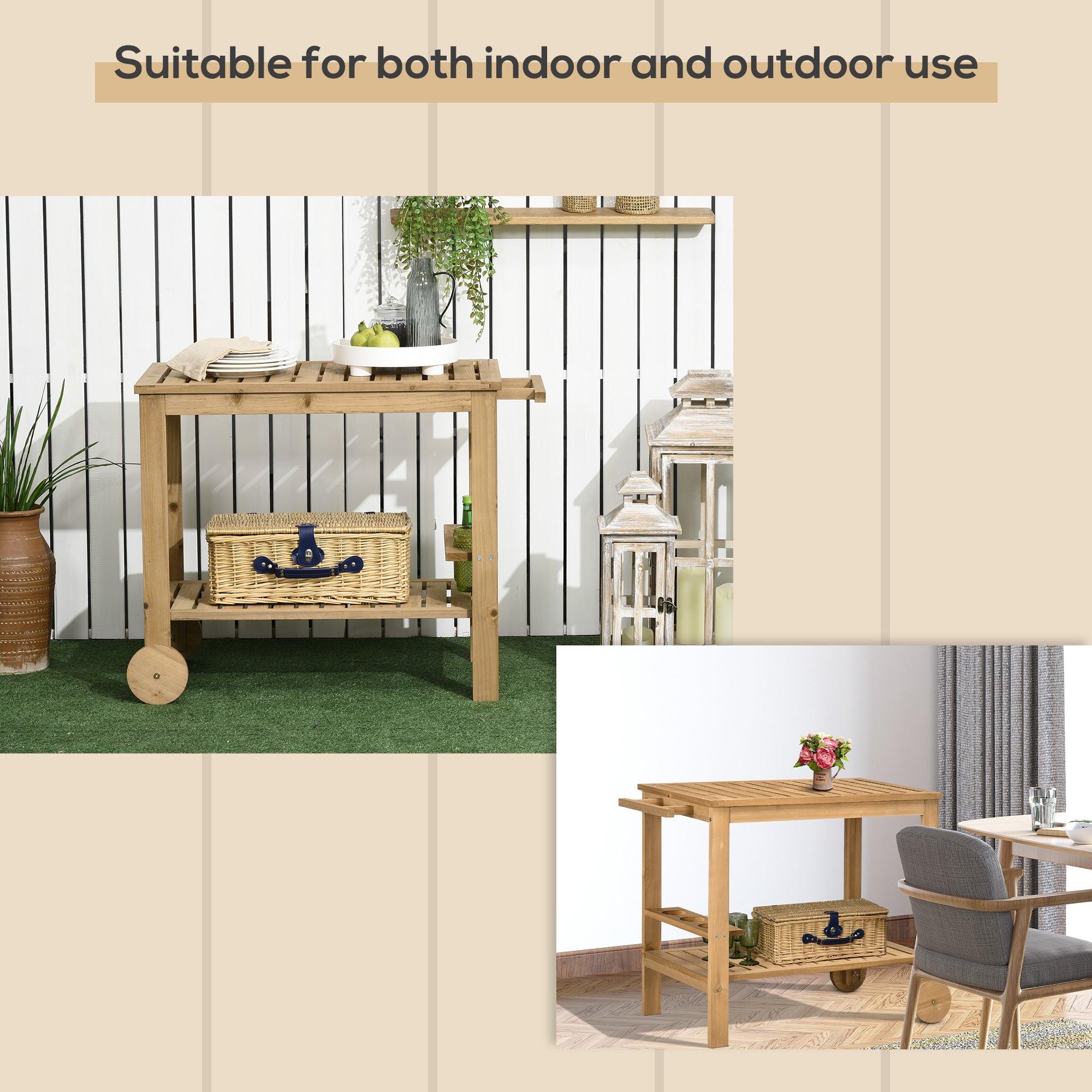 - Wooden Cart: Offering a friendly farmhouse charm our outdoor serving cart is crafted out of solid fir wood. The fir wood surface has been protected with a clear coat, helping it withstand water while still allowing the natural woodgrain texture to shine through.