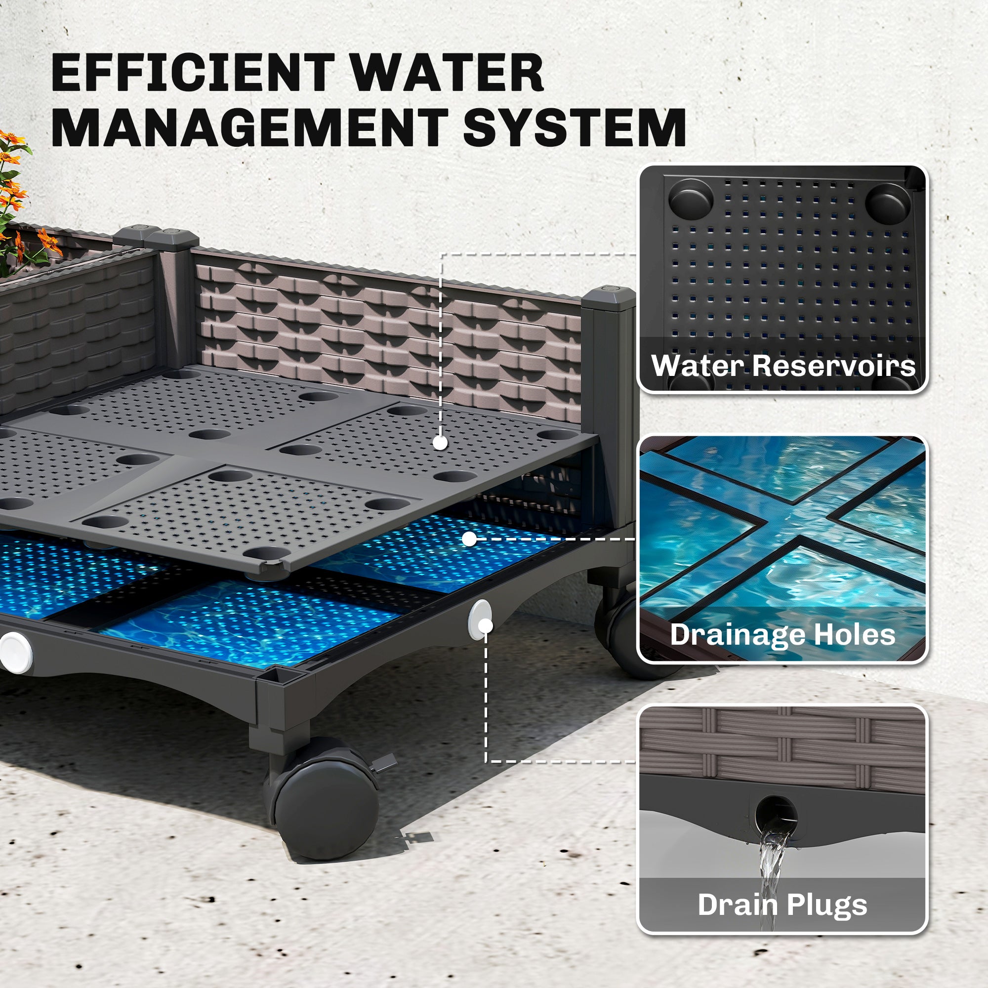 - Self-Watering System: The built-in reservoir in this raised garden bed keeps soil consistently moist, reducing the need for daily watering - suitable for hot summer days. Six drainage holes plus drain plugs allow you to release or retain excess water.