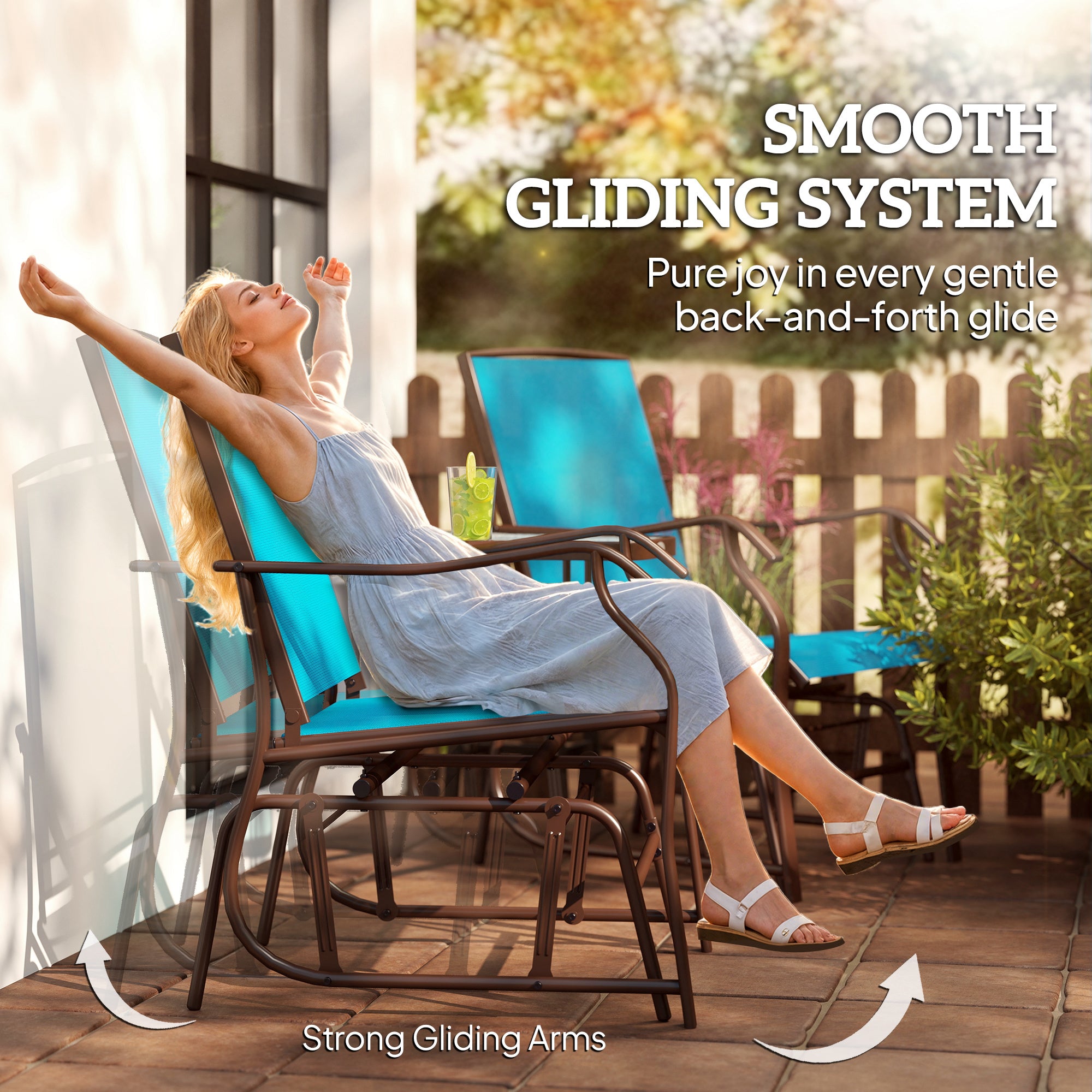 Built with four swing arms connecting the seat frame, this glider is designed to move smoothly forward and backwards while remaining stable on the ground. The balanced gliding structure allows the chair to follow your natural body movement, creating a calm, controlled motion that feels relaxing rather than abrupt—ideal for everyday outdoor seating.