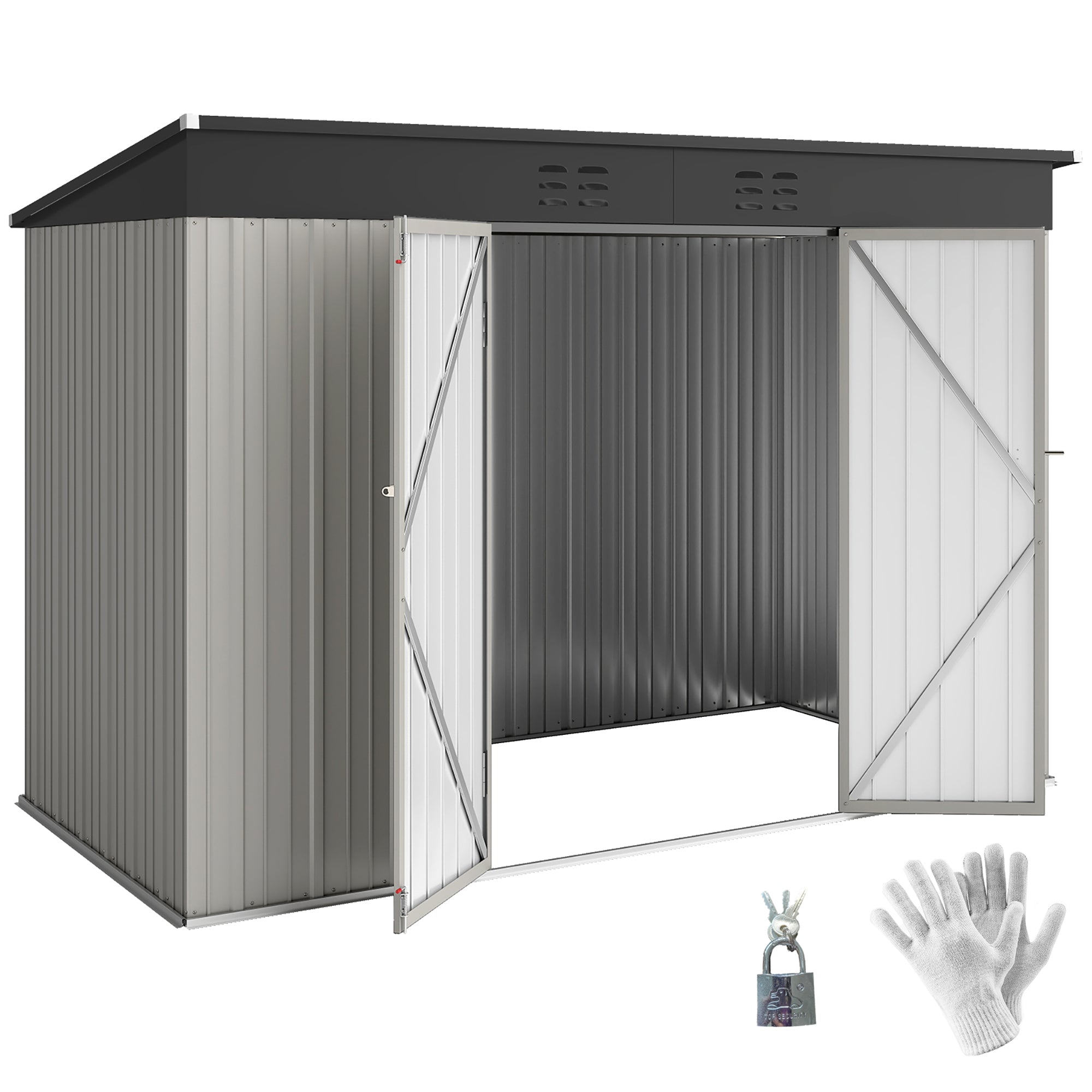 • 9' x 4' Storage Shed, Galvanized Steel Garden Shed, Wide Double Door with Lock, Gloves and 2 Air Vents for Backyard, Patio, Lawn, Grey