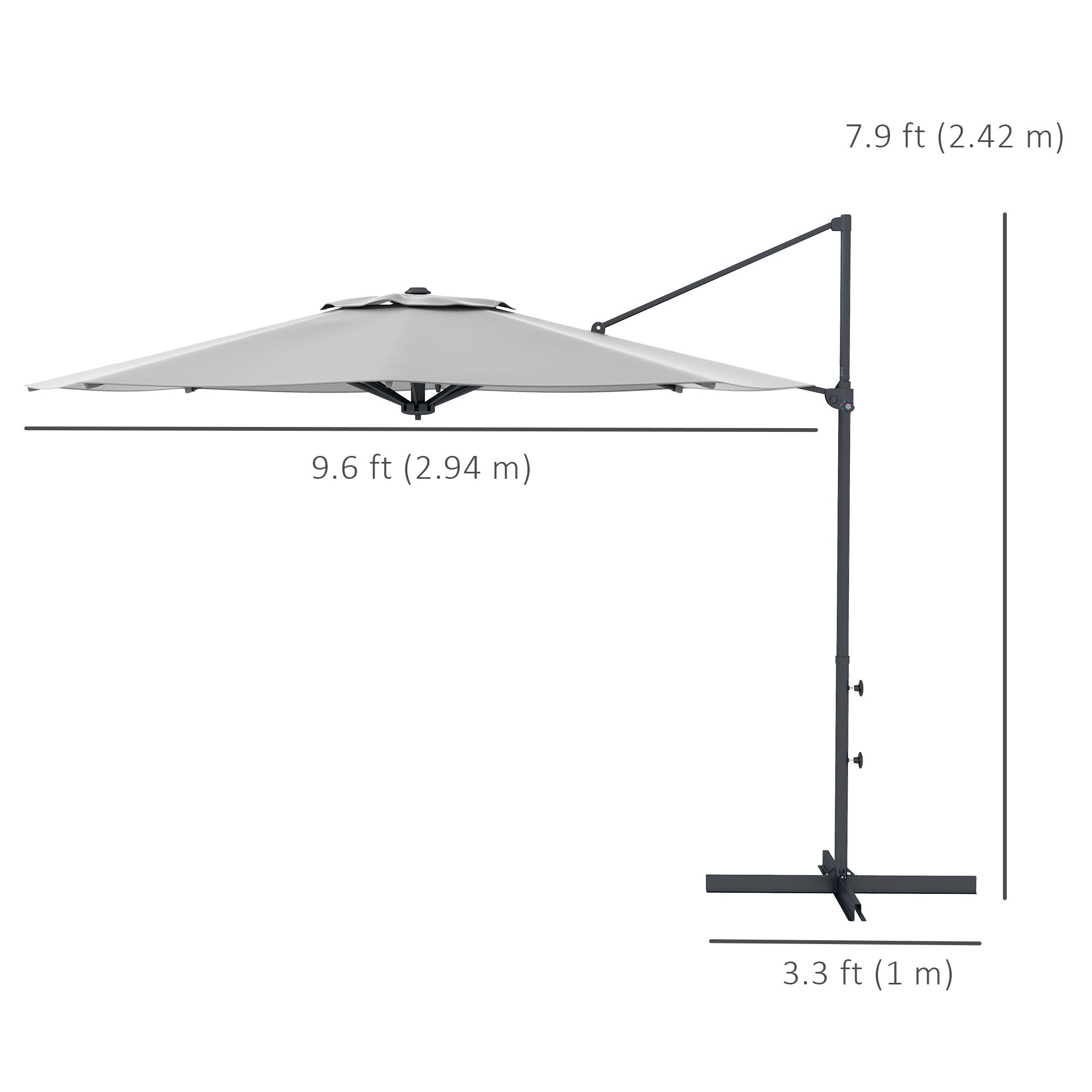 Keep yourself protected whilst enjoying the sun all day with this cantilever patio umbrella from Outsunny. Connected to the frame via eight ribs for extra strength. A crank mechanism for effortless opening and closing, this parasol offers you ample shade from sunlight at an angle you control. Swivel the cross base to shade anywhere across a full 360 degrees. Provides soothing shade for you throughout the summer with our offset patio umbrella.