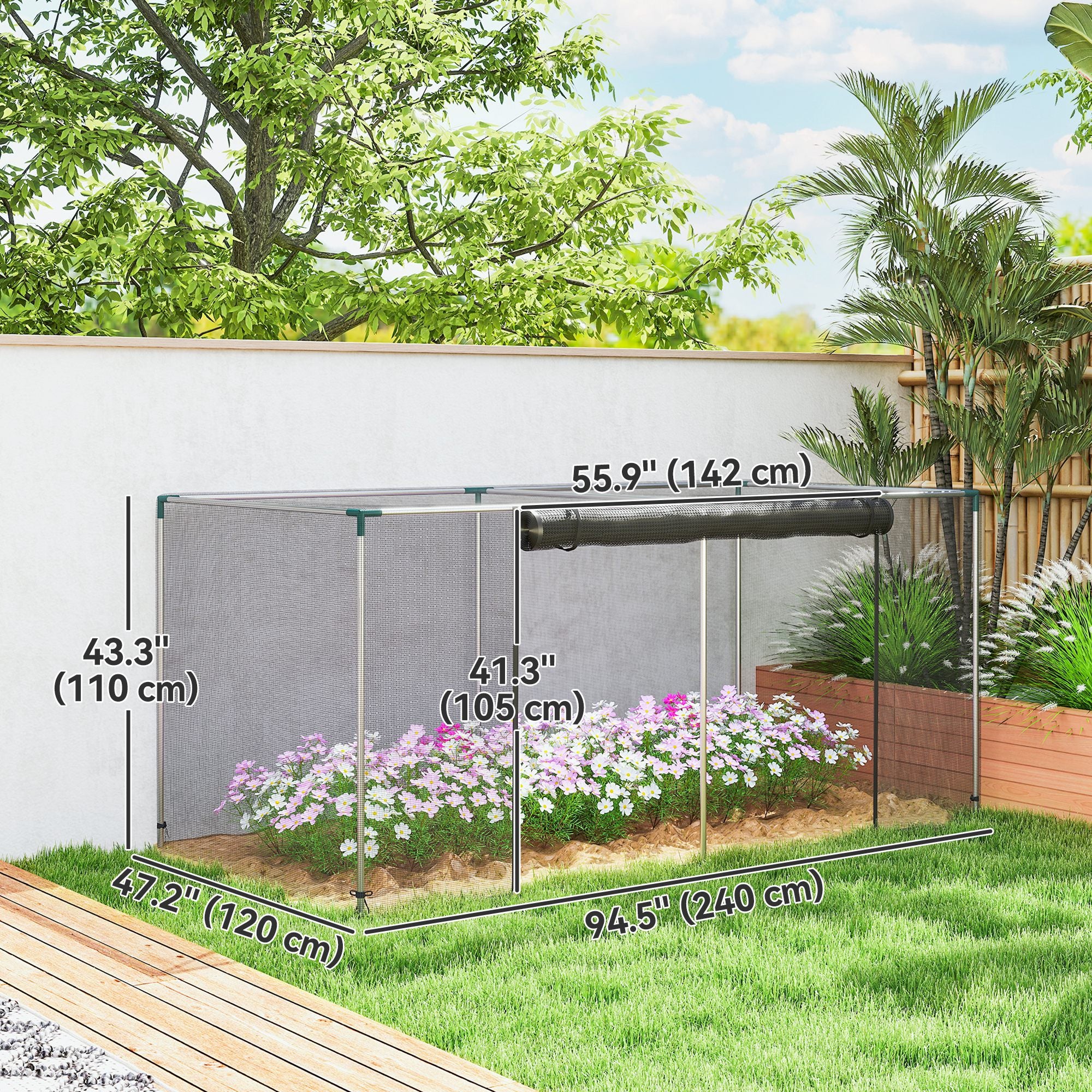 - Plant Protector from Animals Info: Overall Dimensions: 94.5" W x 47.2" D x 43.3" H (240 x 120 x 110 cm). Door Size: 55.9" W x 41.3" H (142 x 105 cm). 1-2 people for easier assembly.