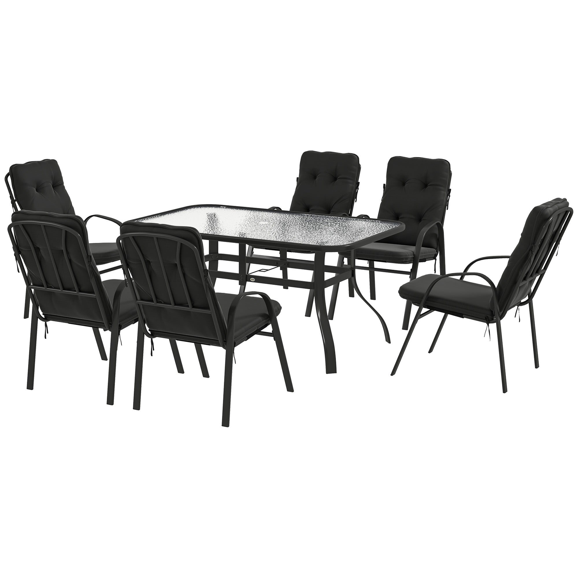Enjoy your socialising time outdoors comfortably - look to this garden table and chairs set from Outsunny. Comes with six padded armchairs and a tempered glass-top table. Steel frames make each piece strong. High backs and armrests on the chairs for support, with a padded seat for comfort. The table is fitted with a tempered glass tabletop - comes with a middle hole to hold a parasol umbrella in place (Ф38 mm sized pole).