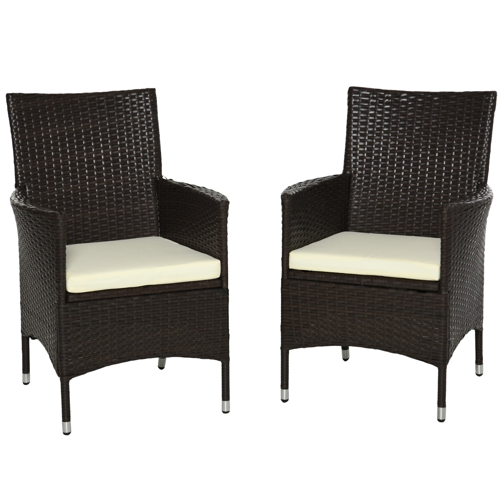 These two Outsunny rattan dining chairs are a great complement to your outdoors, whether standing alone or matched with other furniture. The garden dining chairs have a galvanised metal frame for a tough and fully supportive structure, wrapped in plastic rattan for durability and style. Tall backs and armrests for support, each chair has a cushion for comfort. Start the season the right way - start it with this stylish two-part set.