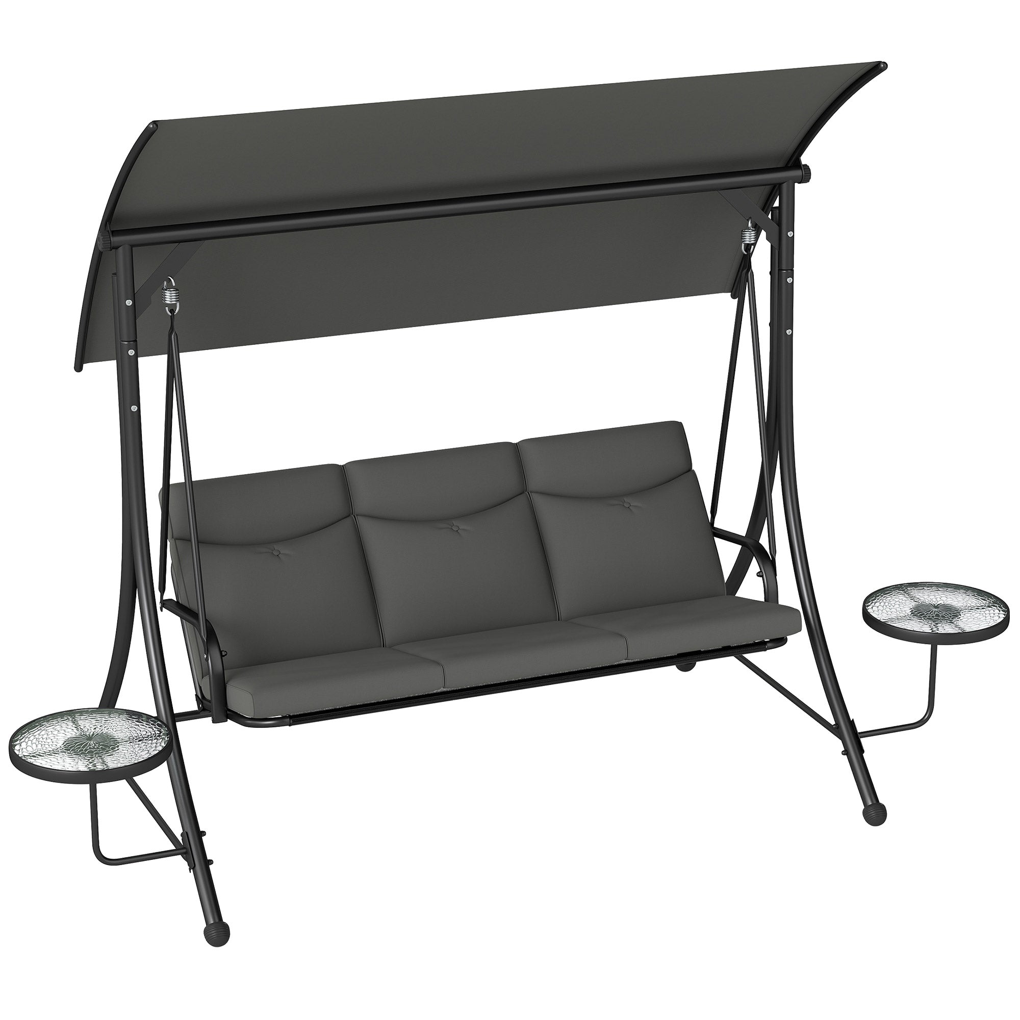 A classic patio swing with a sleek update - two glass tables: this Outsunny swing bench is before than ever before. With a steel frame for a strong core, plus the 'A' legs to stand balanced. Three-seater size offers plenty of room to relax, with a padded seat and back cushion for comfort. The round glass-top tables on each side give you somewhere safe to keep drinks, magazines and more within easy reach. Comes with an adjustable canopy to shelter from the elements.