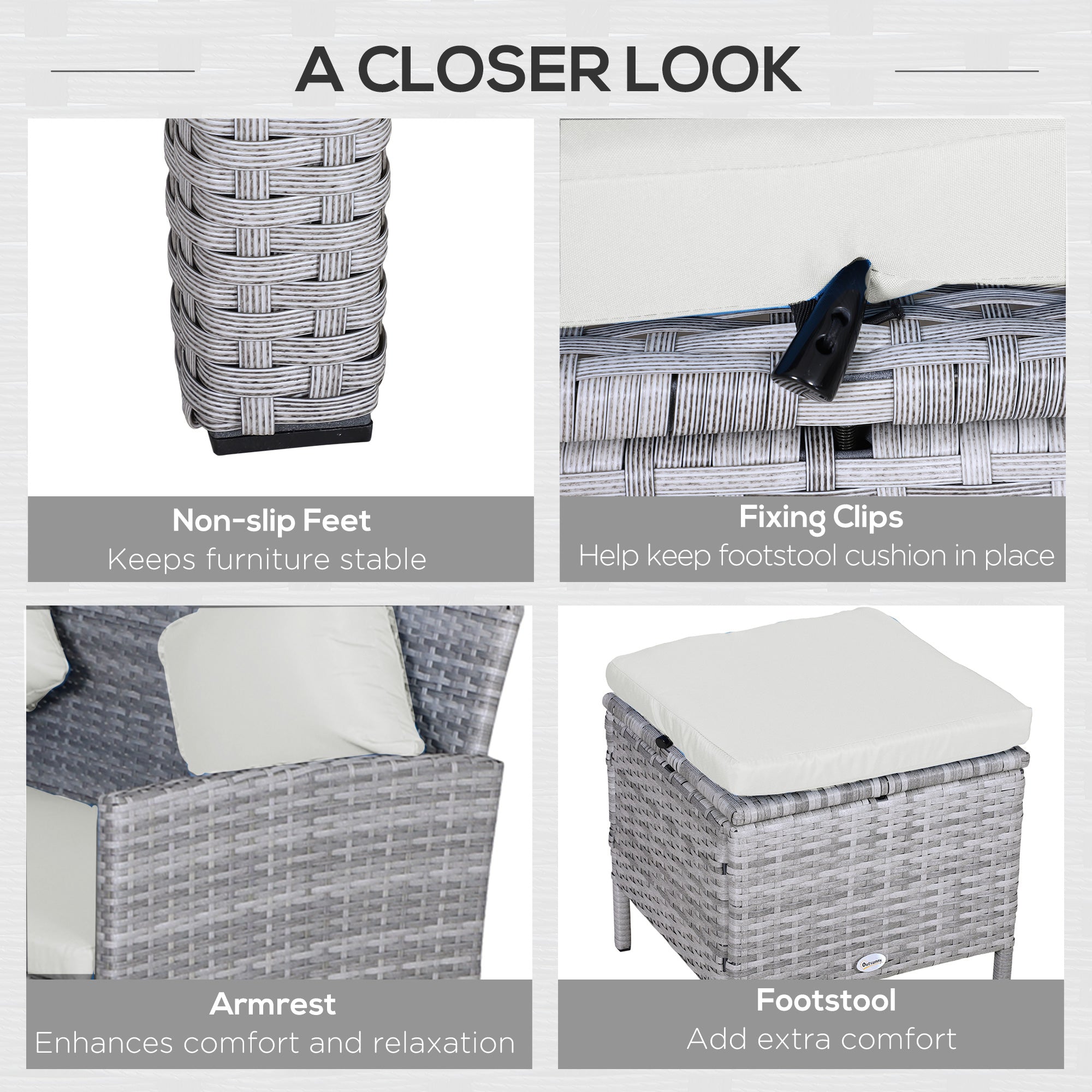 - Galvanised metal wrapped in PE Rattan: UV and water-resistant, the corner garden furniture is suitable for outdoor living. Each stool includes 2 connecting buckles for securing cushion.