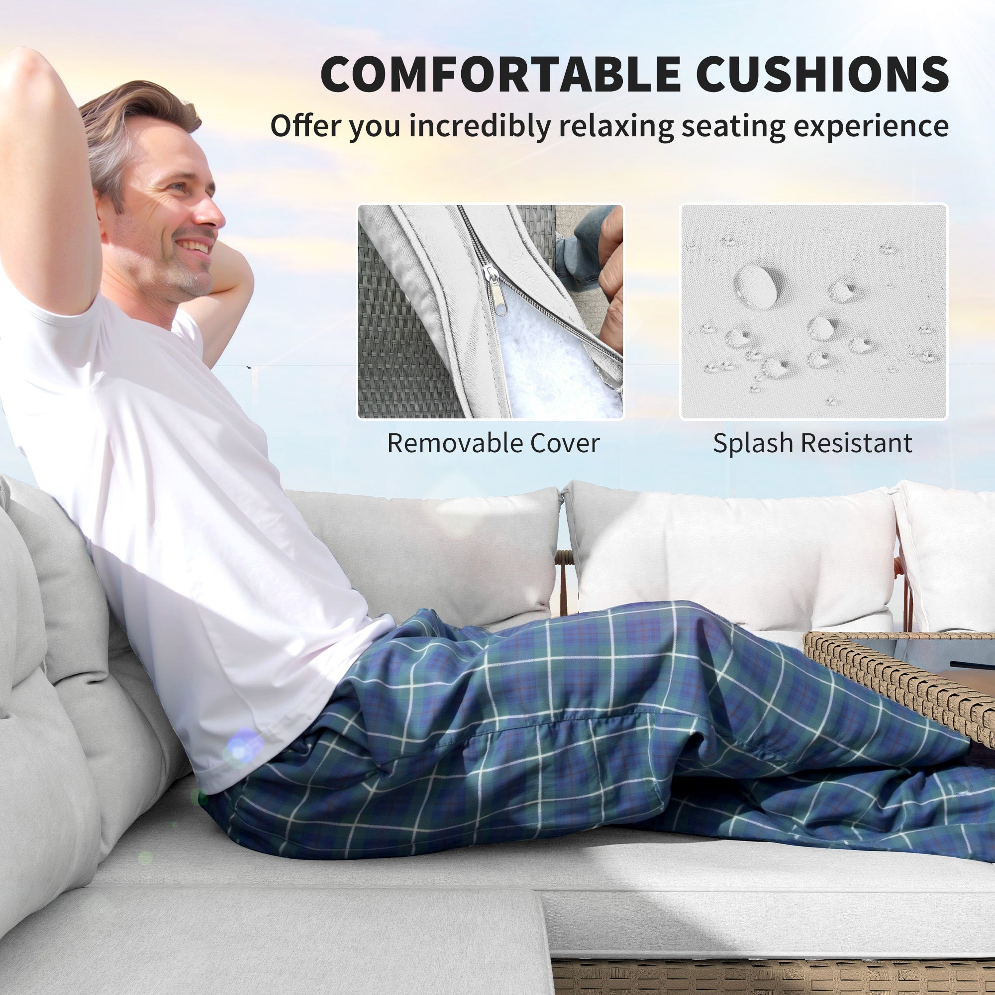 - Quality materials: Crafted with robust steel and wrapped in all-weather wicker PE rattan, this garden corner sofa set is built to endure the outdoors. Its UV-resistant and splash-proof construction ensures it remains stylish and strong