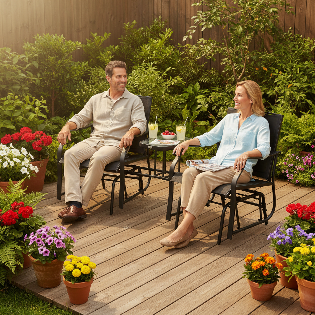 - Middle glass-top table: Made from glass for easy maintenance. Excellent place on garden rocker for keeping drinks, books and more close to hand.