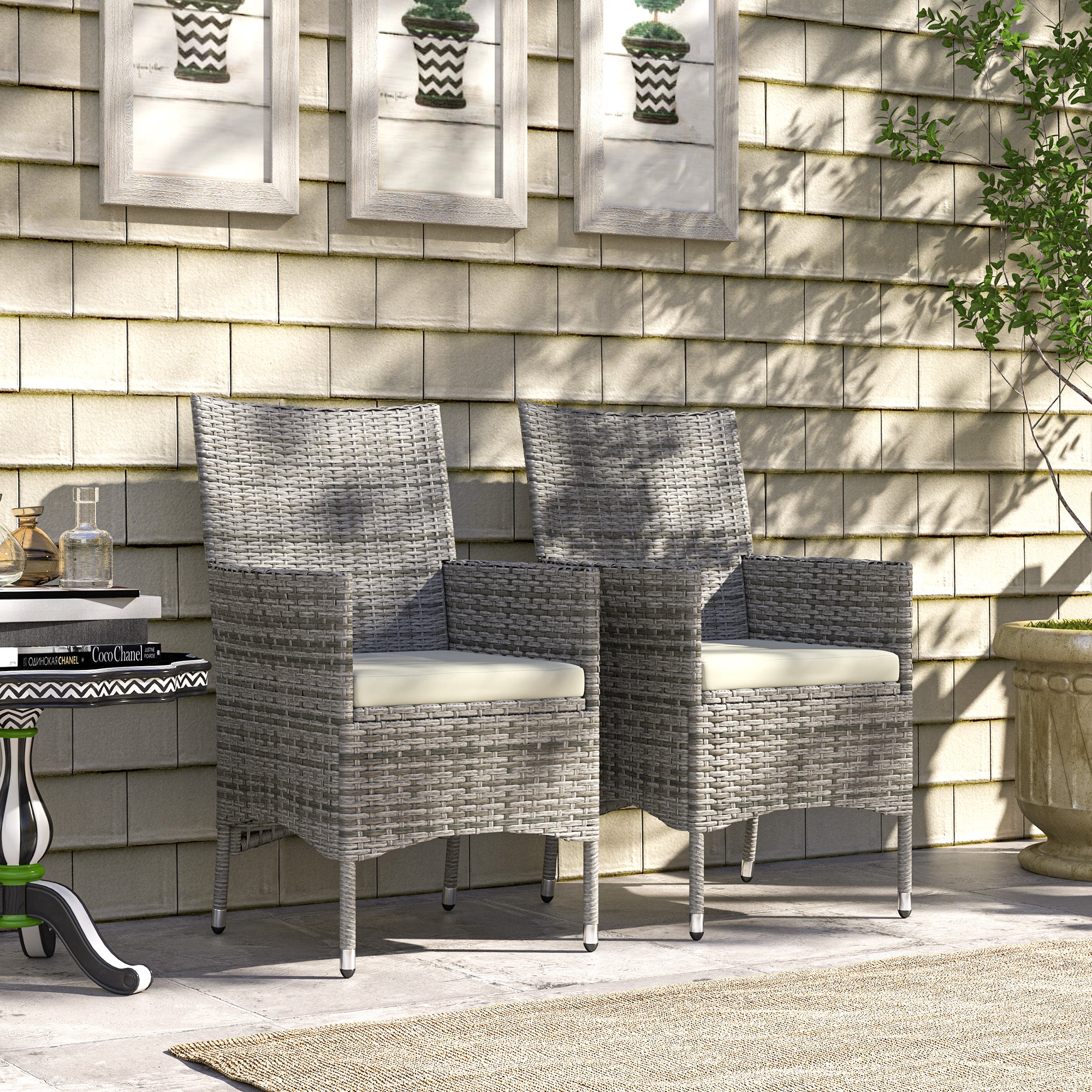 • 2 Pieces Outdoor PE Rattan Dining Chairs Set with Cushion, Garden Armchair with Armrests, High Backrest, Metal Frame Patio Wicker Furniture, Mixed Grey