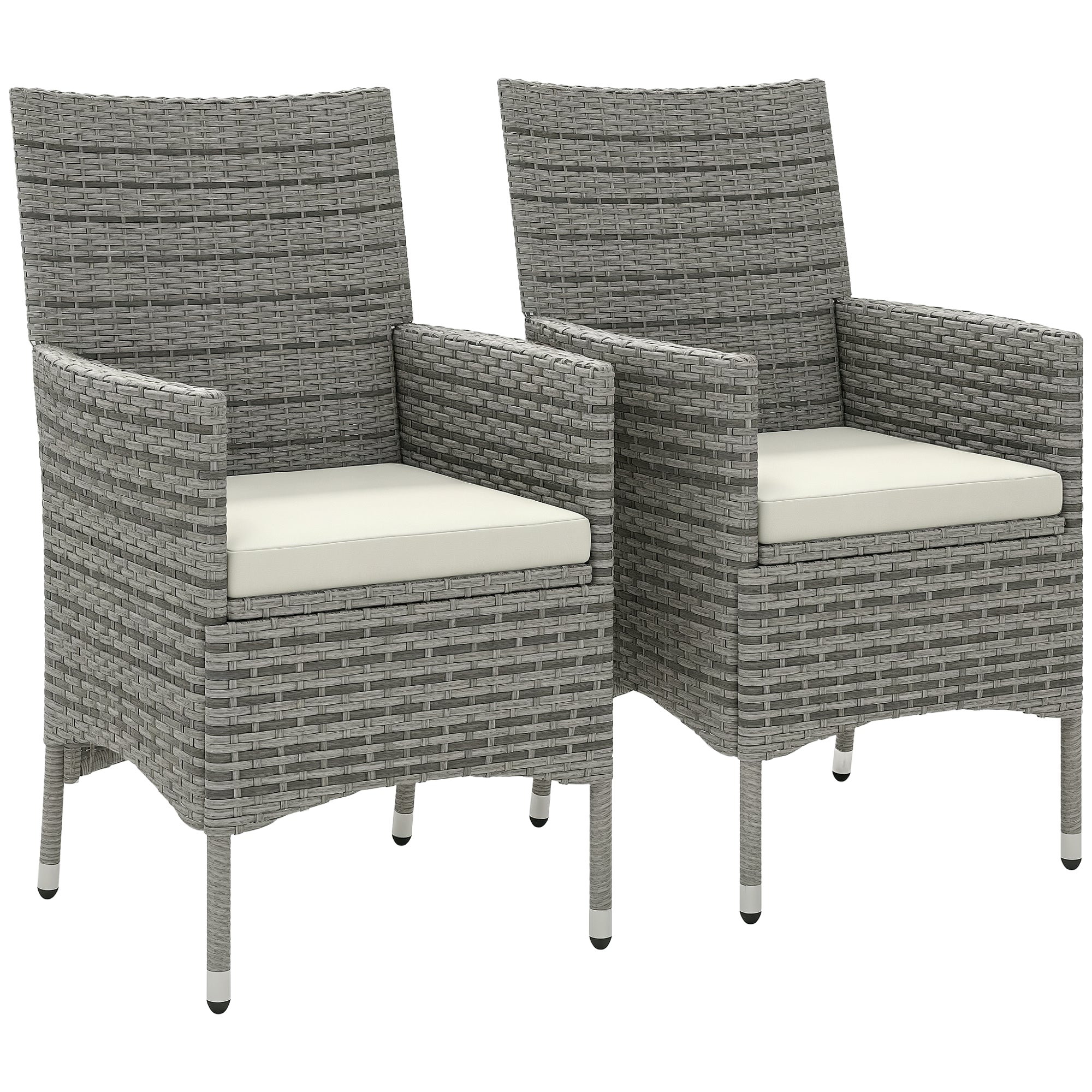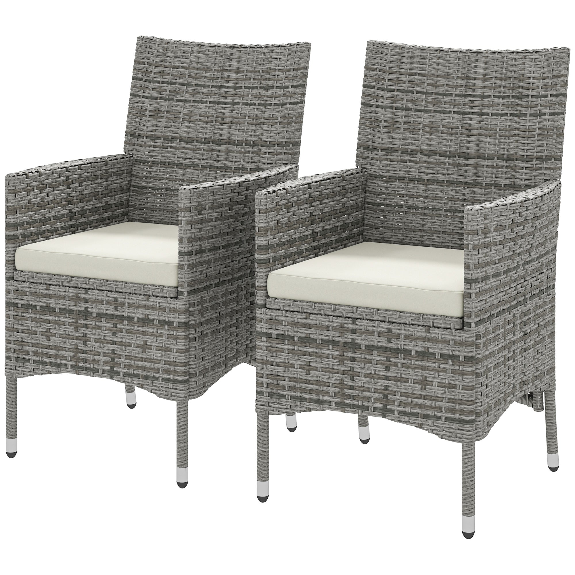 These two Outsunny rattan dining chairs are a great complement to your outdoors, whether standing alone or matched with other furniture. The garden dining chairs have a galvanised metal frame for a tough and fully supportive structure, wrapped in plastic rattan for durability and style. Tall backs and armrests for support, each chair has a cushion for comfort. Start the season the right way - start it with this stylish two-part set.