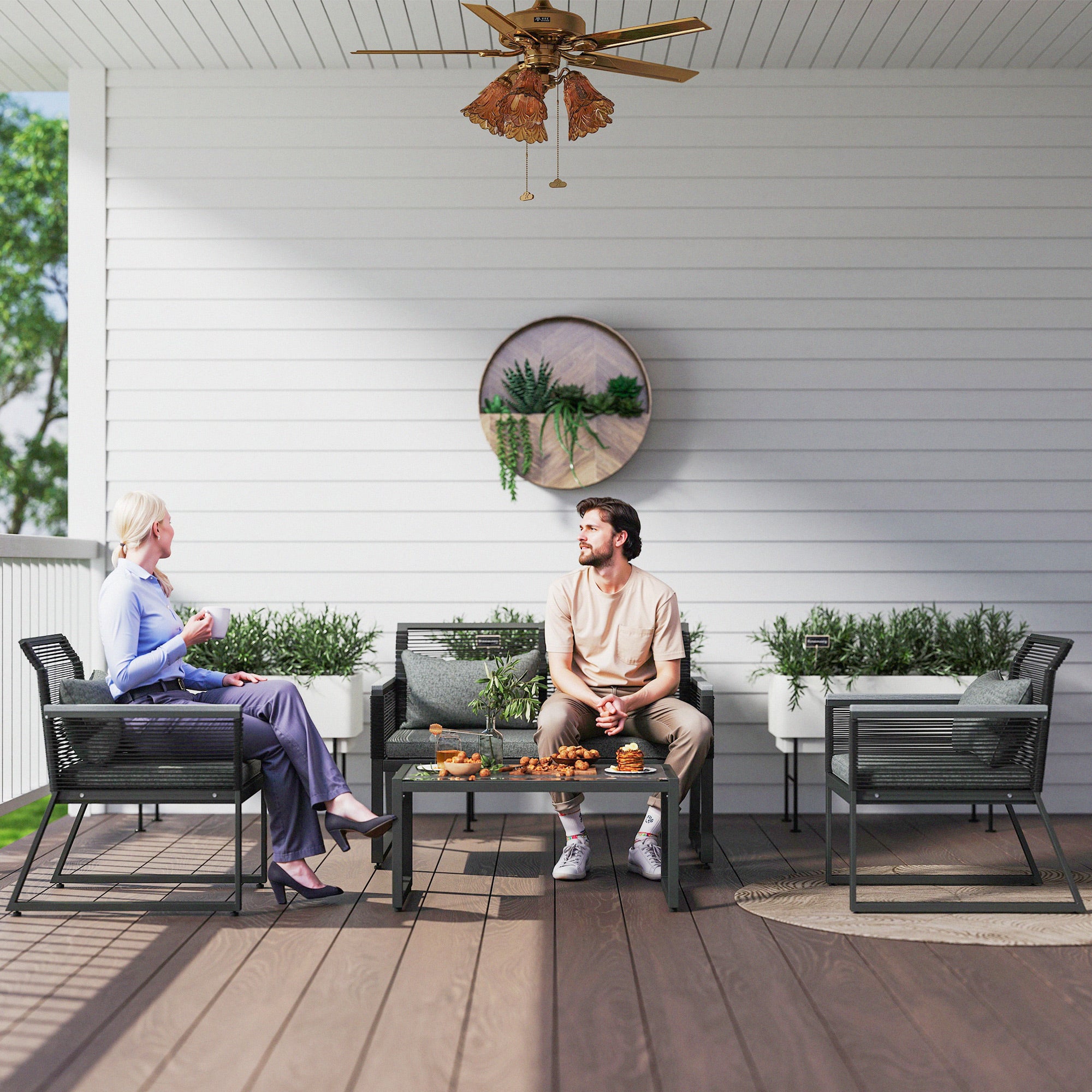 - Four pieces rattan sofa set: The rattan garden furniture set includes two armrest chairs, a loveseat and a coffee table with grey tempered glass top, great for family and friends to enjoy outdoors together