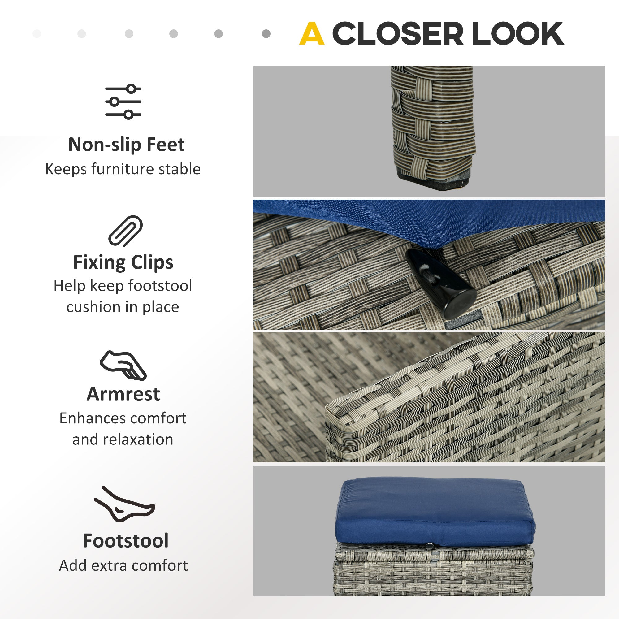 - Galvanised metal wrapped in PE Rattan: UV and water-resistant, the corner garden furniture is suitable for outdoor living. Each stool includes 2 connecting buckles for securing cushion.