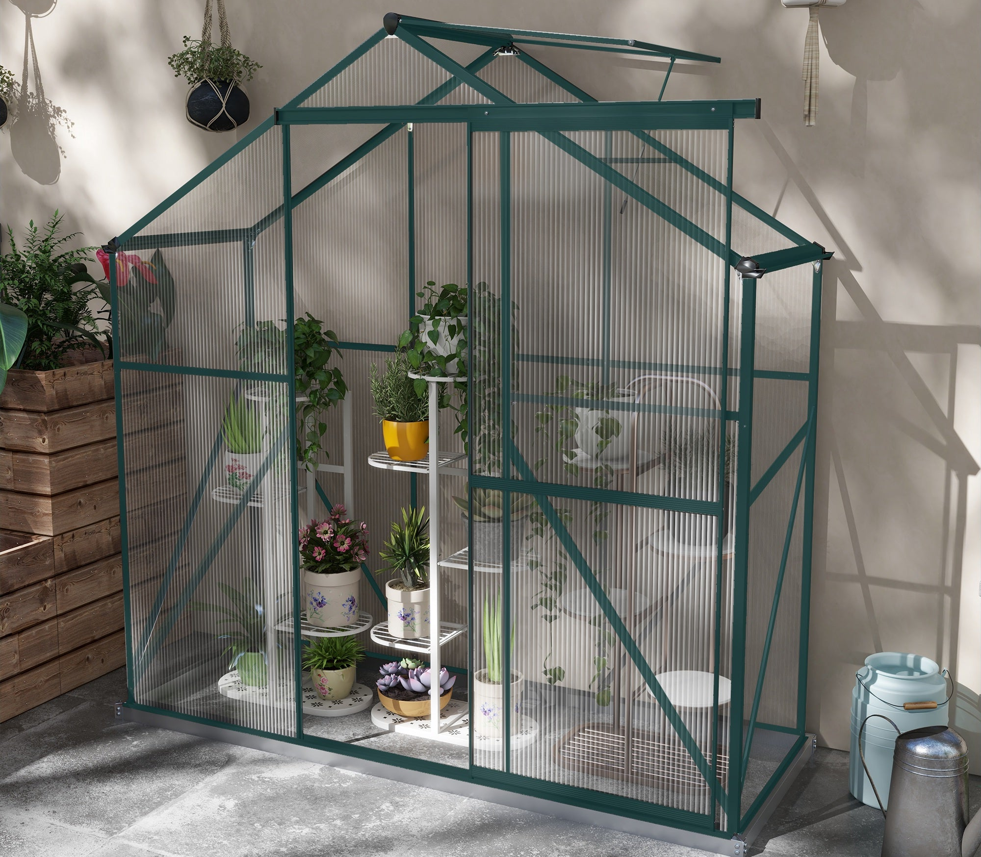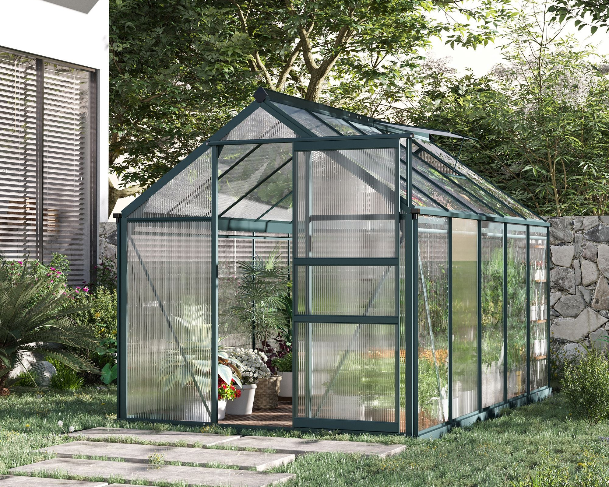 Generous walk-in greenhouse designed for those who want space to plant, plan and perfect their garden. With a strong powder-coated aluminium frame and clear polycarbonate panels, it offers both protection and light for your plants. Featuring a smooth sliding door and lift-up roof vents for effortless access and ventilation.