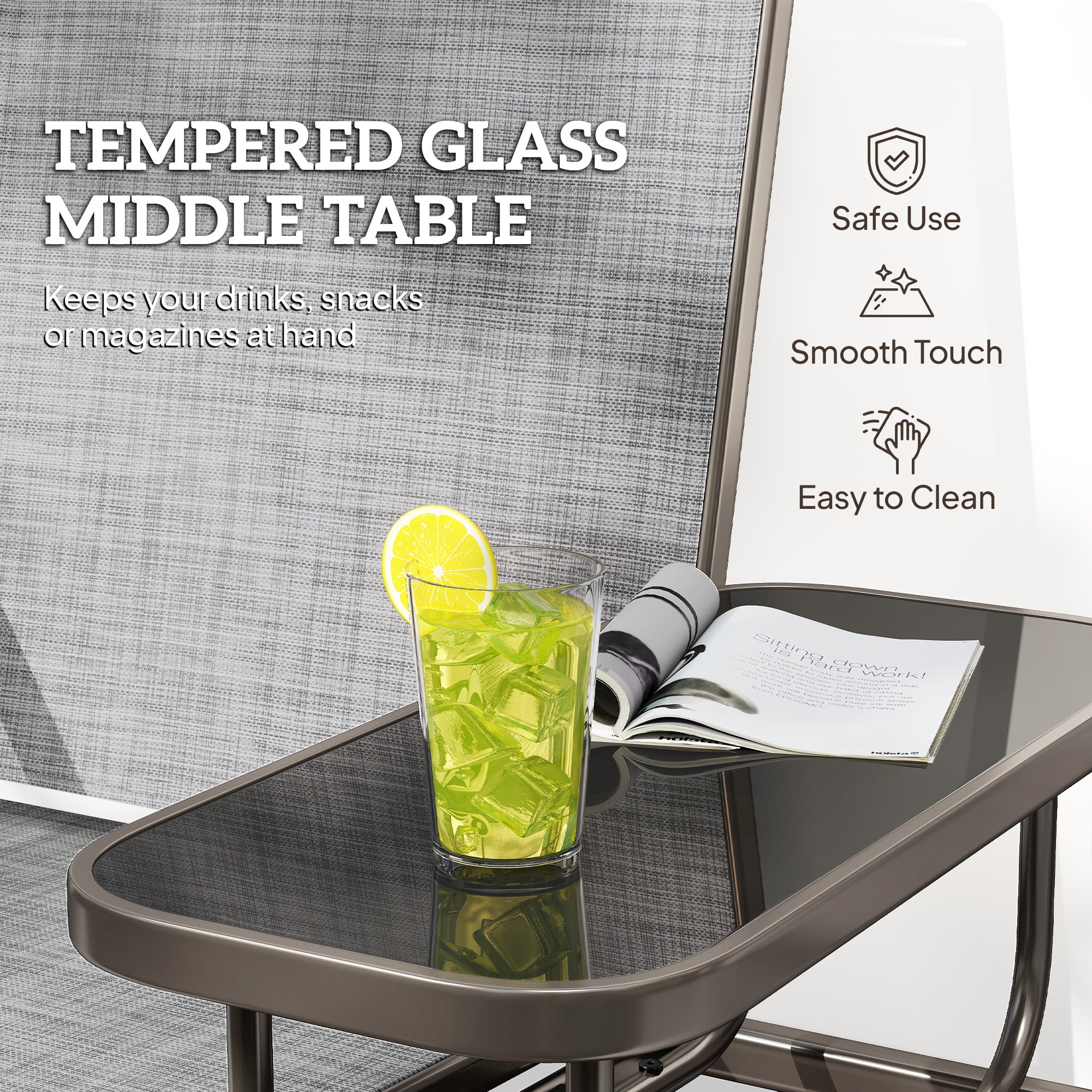 2 Seats Garden Glider Bench with Glass Top Centre Table, Brown/ Grey
