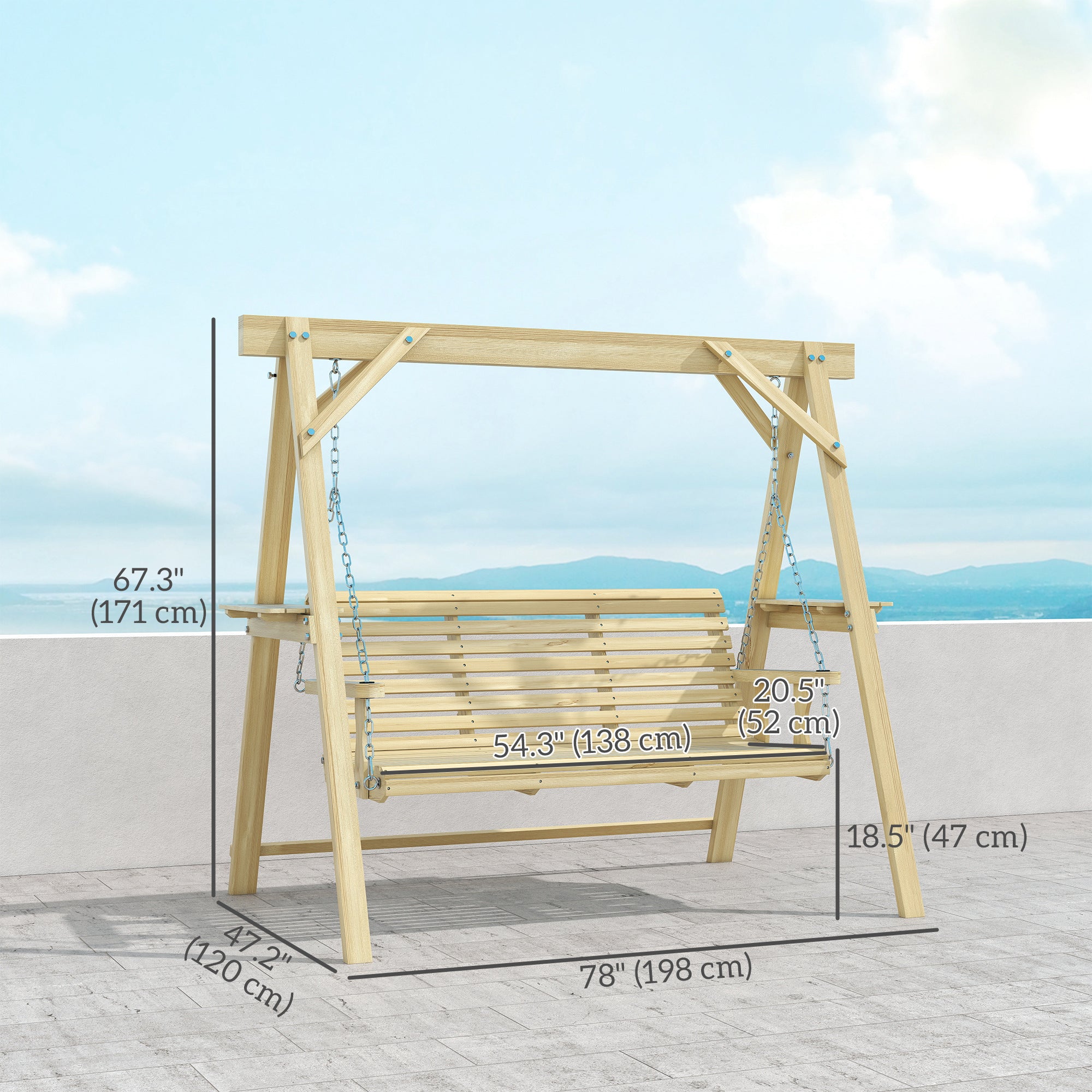 • 3 Seat Porch Swing with Stand, Wooden Patio Swing Chair with Side Tables and Metal Chains, Outdoor Swing Bench for Garden, Poolside, Backyard, Natural Wood
