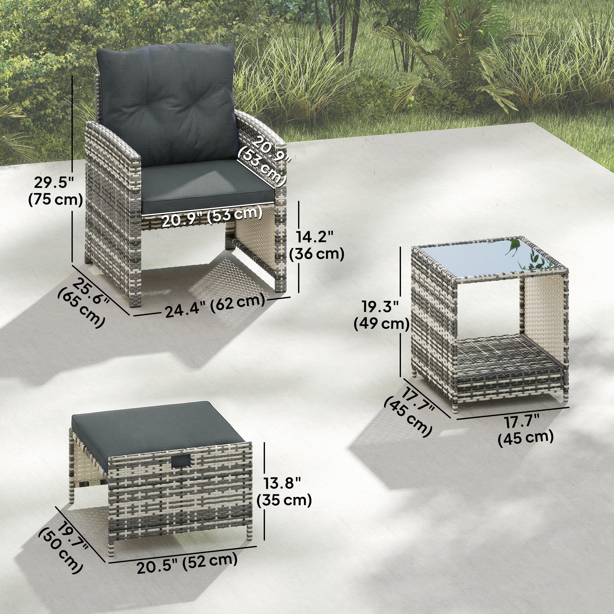 - Épaisseur du coussin : 2" (5 cm) (fauteuil/repose-pieds), 3,1" (8 cm) (table) ;