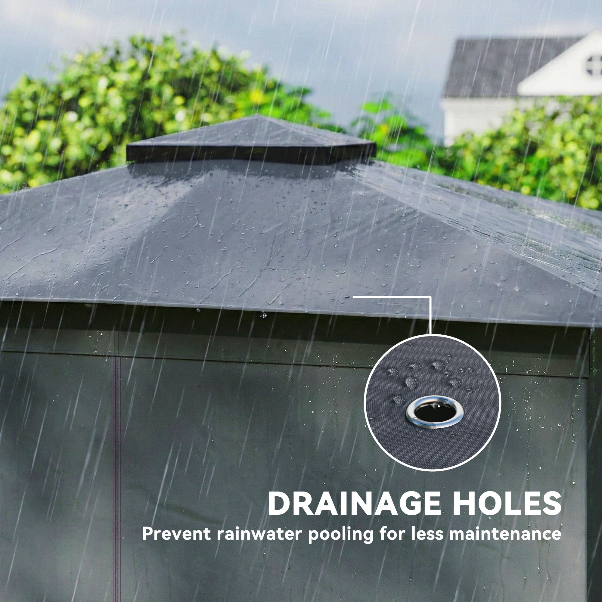 - Double-roof Design: Stay cool and comfortable with our innovative double-tier UPF30+ polyester roof pavilion gazebo, designed with built-in netting for superior ventilation and protection from unwanted guests. Plus, drainage holes prevent water pooling
